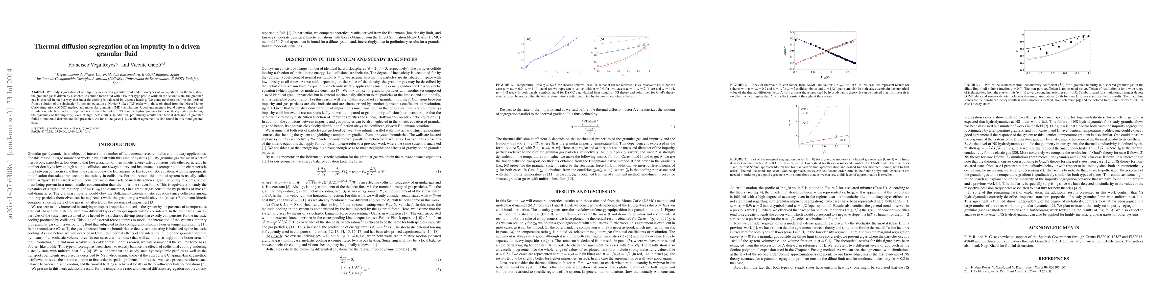 This paper investigates impurity segregation in driven granular fluids under two steady states, comparing theoretical results from the Boltzmann equation to Direct Monte Carlo and molecular dynamics simulations. The study finds strong agreement, supporting the reliability of Navier-Stokes granular hydrodynamics, even at high inelasticities, and presents preliminary results on thermal diffusion in granular fluids.