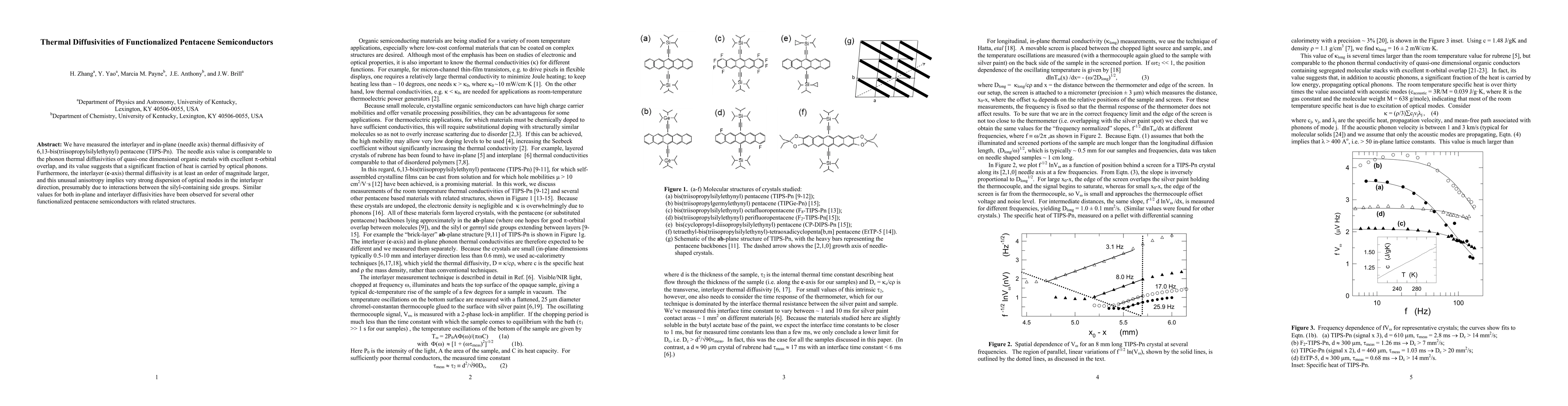 We have measured the interlayer and in-plane (needle axis) thermal diffusivities of 6,13-bis(triisopropylsilylethynyl) pentacene (TIPS-Pn). The needle axis value is comparable to the phonon thermal conductivities of quasi-one dimensional organic metals with excellent pi-orbital overlap, and its value suggests that a significant fraction of heat is carried by optical phonons. Furthermore, the interlayer (c-axis) thermal diffusivity is at least an order of magnitude larger, and this unusual anisotropy implies very strong dispersion of optical modes in the interlayer direction, presumably due to interactions between the silyl-containing side groups. Similar values for both in-plane and interlayer diffusivities have been observed for several other functionalized pentacene semiconductors with related structures.