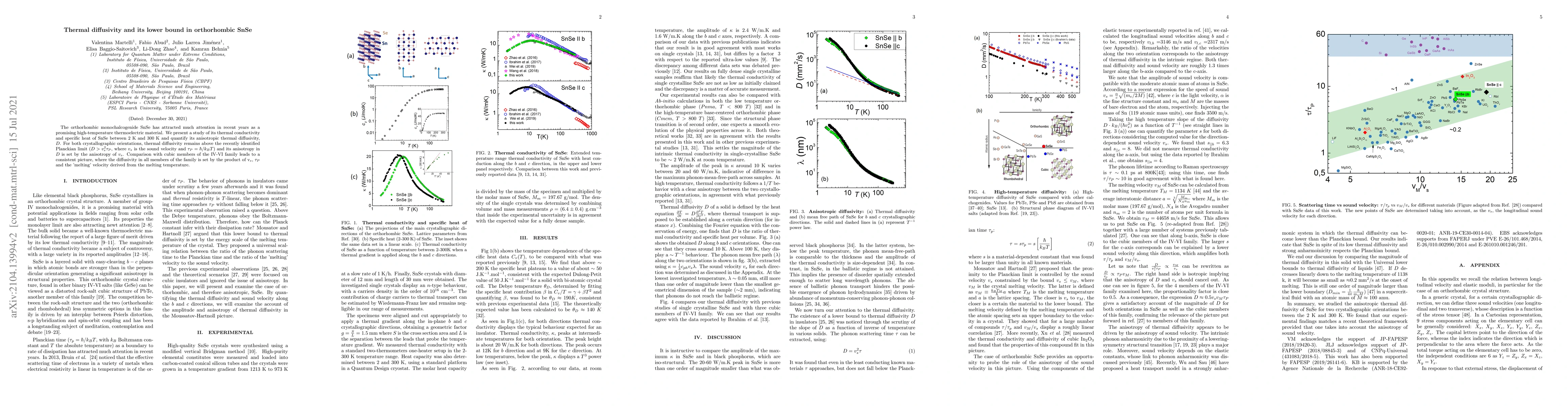 The paper presents a detailed analysis of thermal diffusivity and its lower bound in orthorhombic SnSe, comparing it with cubic IV-VI family members and establishing a consistent picture based on sound velocity and melting temperature-derived velocity.