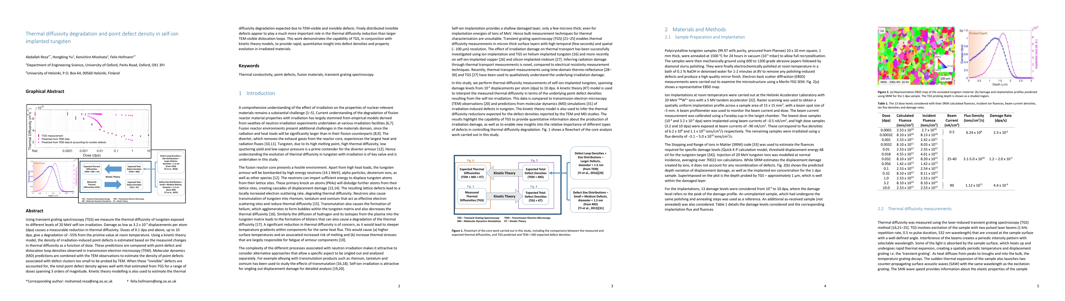 This study uses transient grating spectroscopy to measure the thermal diffusivity of tungsten subjected to self-ion irradiation, revealing significant degradation at low displacement levels. Kinetic theory models and TEM observations show that invisible point defects contribute more to thermal diffusivity reduction than visible dislocation loops.