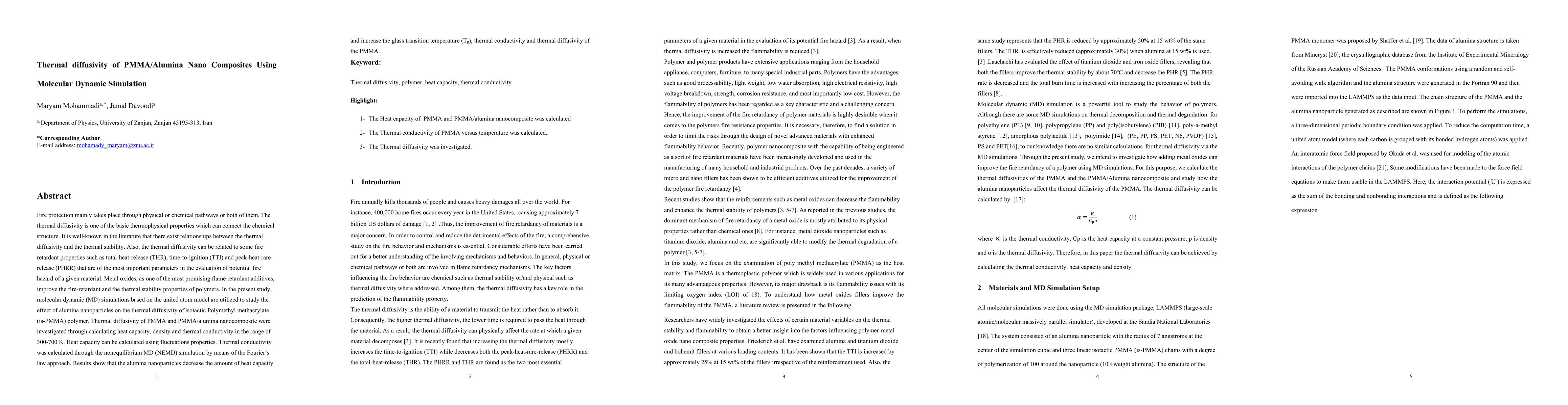 This study uses molecular dynamic simulations to investigate how alumina nanoparticles affect the thermal diffusivity of isotactic Polymethyl methacrylate (is-PMMA) polymer. The research aims to understand the relationship between thermal diffusivity and fire retardant properties, highlighting the potential fire-retardant benefits of metal oxides in polymers.