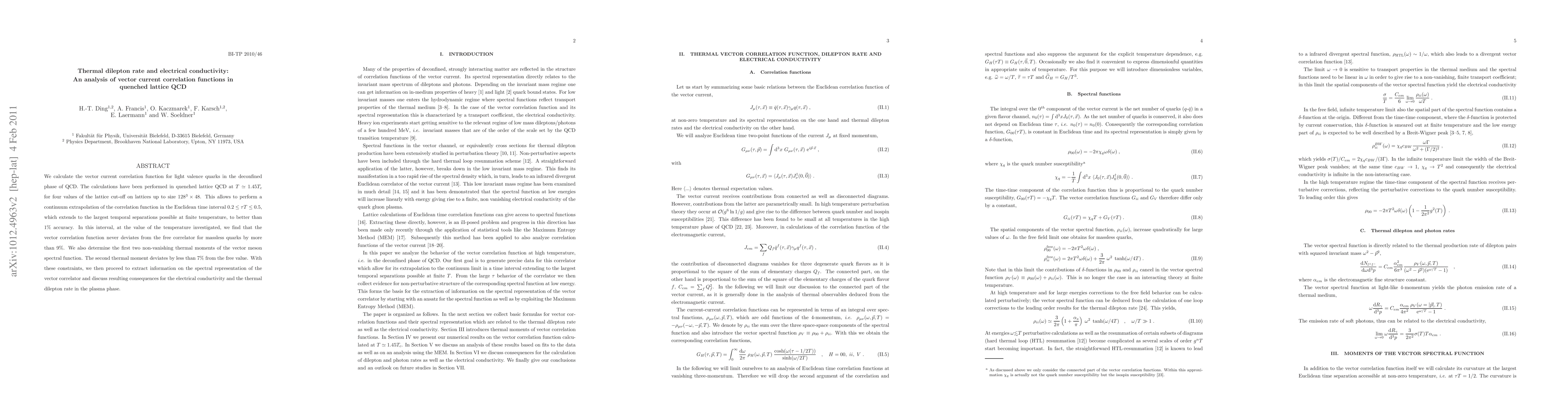 This paper calculates vector current correlation functions in quenched lattice QCD at high temperatures, finding minimal deviation from free correlators. It also determines thermal moments of the vector meson spectral function, using these results to discuss implications for electrical conductivity and thermal dilepton rates in the plasma phase.