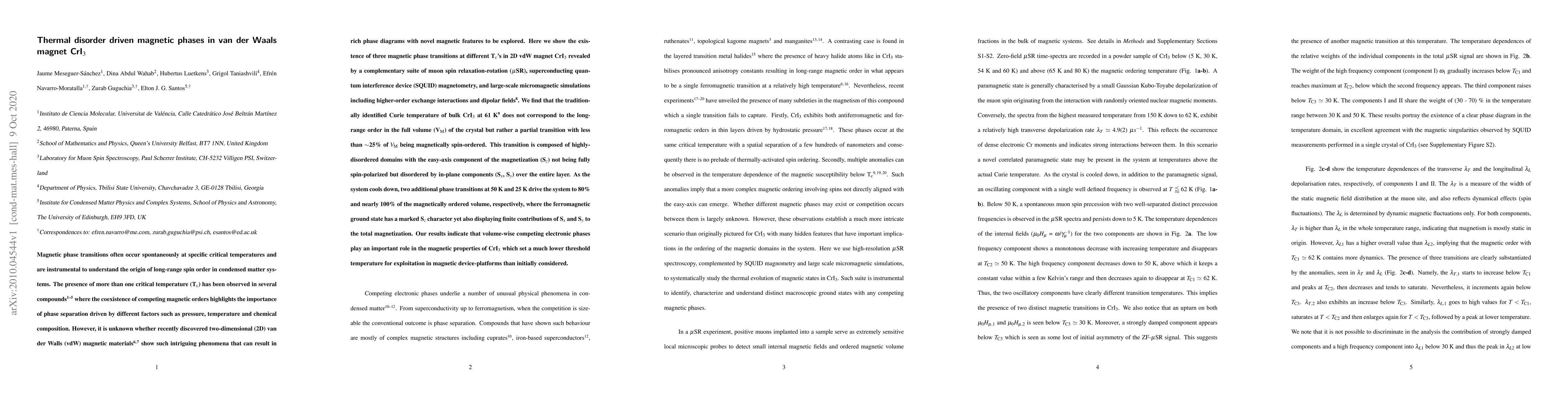This study reveals three magnetic phase transitions in the 2D van der Waals magnet CrI3, driven by thermal disorder, with the traditionally identified Curie temperature not representing full magnetic order. The findings suggest that competing electronic phases significantly influence CrI3's magnetic properties, enabling potential applications at lower temperatures than previously thought.