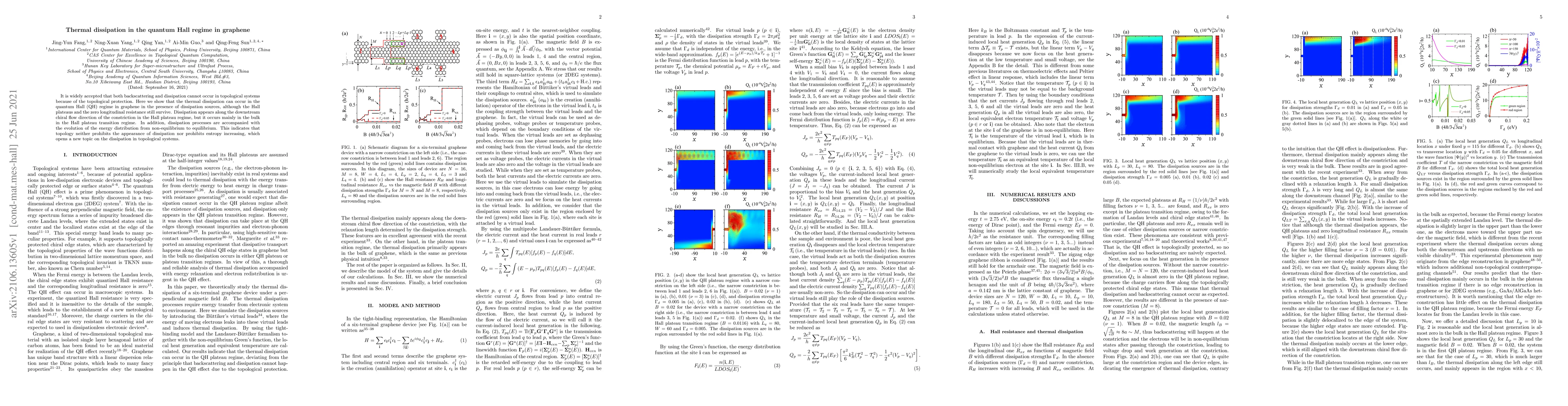This paper demonstrates that thermal dissipation can occur in graphene's quantum Hall regime despite topological protection, primarily in the bulk during the transition between Hall plateaus. It reveals that dissipation does not disrupt the Hall plateaus or zero longitudinal resistance, indicating that topology does not inherently prevent entropy increase or dissipation.