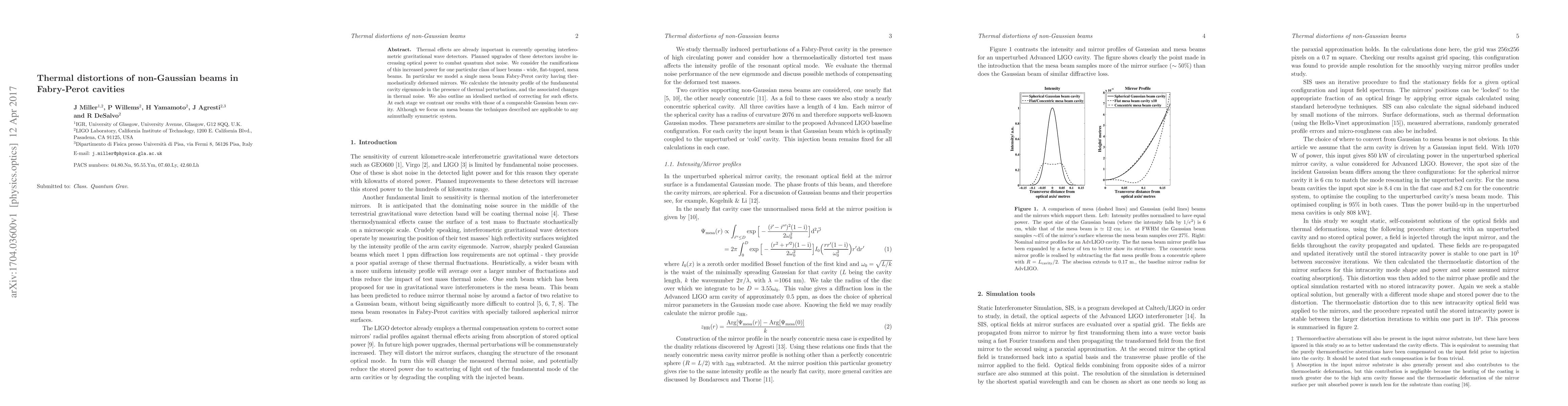 Thermal effects are already important in currently operating interferometric gravitational wave detectors. Planned upgrades of these detectors involve increasing optical power to combat quantum shot noise. We consider the ramifications of this increased power for one particular class of laser beams--wide, flat-topped, mesa beams. In particular we model a single mesa beam Fabry-Perot cavity having thermoelastically deformed mirrors. We calculate the intensity profile of the fundamental cavity eigenmode in the presence of thermal perturbations, and the associated changes in thermal noise. We also outline an idealized method of correcting for such effects. At each stage we contrast our results with those of a comparable Gaussian beam cavity. Although we focus on mesa beams the techniques described are applicable to any azimuthally symmetric system.