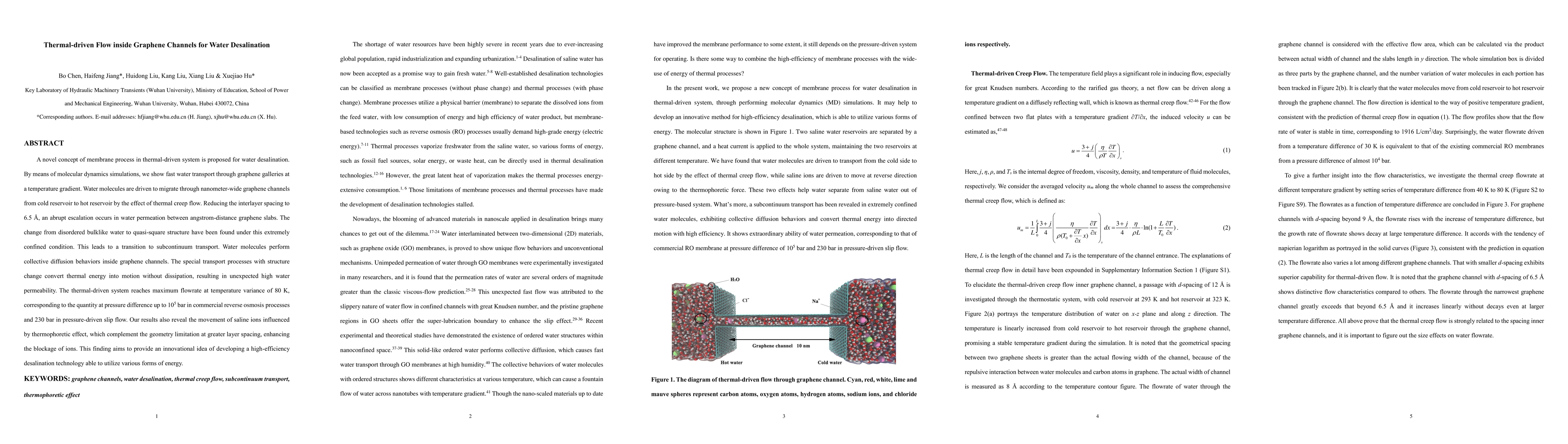 This paper proposes a novel thermal-driven desalination method using graphene channels, where water molecules migrate through graphene galleries driven by thermal creep flow, resulting in high water permeability and efficient ion blockage. The study highlights the transition to subcontinuum transport and collective diffusion behaviors under extreme confinement.