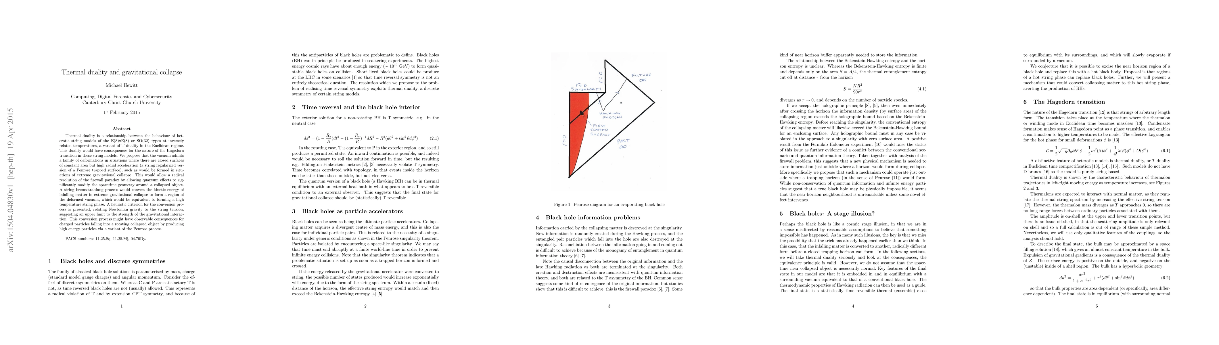 Thermal duality is a relationship between the behaviour of heterotic string models of the $E(8)x E(8)$ or $SO(32)$ types at inversely related temperatures, a variant of T duality in the Euclidean regime. This duality would have consequences for the nature of the Hagedon transition in these string models. We propose that the vacuum admits a family of deformations in situations where there are closed surfaces of constant area but high radial acceleration (a string regularized version of a Penrose trapped surface), such as would be formed in situations of extreme gravitational collapse. This would allow a radical resolution of the firewall paradox by allowing quantum effects to significantly modify the spacetime geometry around a collapsed object. A string bremsstrahlung process would convert the kinetic energy of infalling matter in extreme gravitational collapse to form a region of the deformed vacuum, which would be equivalent to forming a high temperature string phase. This process might have observable consequences for charged particles falling into a rotating collapsed object by producing high energy particles via a variant of the Penrose process.