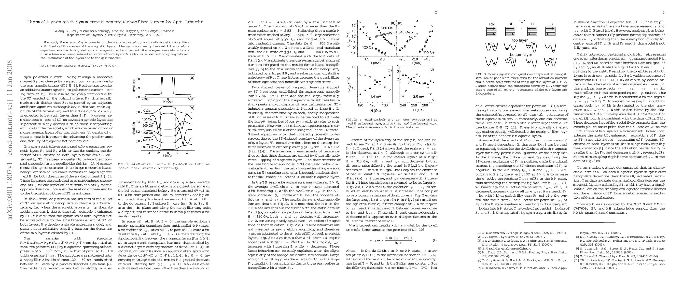 The paper presents a comprehensive analysis of thermally activated dynamics in symmetric magnetic nanopillars driven by spin transfer torque, identifying coupling between layers and proposing a model for dwell times.