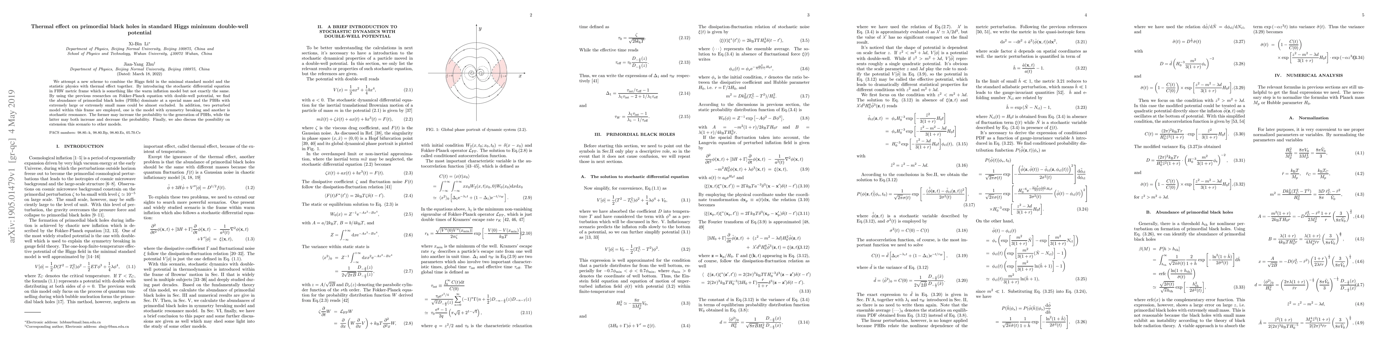 We attempt a new scheme to combine the Higgs field in the minimal standard model and the statistic physics with thermal effect together. By introducing the stochastic differential equation in FRW metric frame which is something like the warm inflation model but not exactly the same. By using the previous researches on Fokker-Planck equation with double-well potential, we find the abundance of primordial black holes (PBHs) dominate at a special mass and the PBHs with extremely large or extremely small mass could be almost excluded. In addition, two perturbed model within this frame are employed, one is the model with symmetry breaking and another is stochastic resonance. The former may increase the probability to the generation of PBHs, while the latter may both increase and decrease the probability. Finally, we also discuss the possibility on extension this scenario to other models.