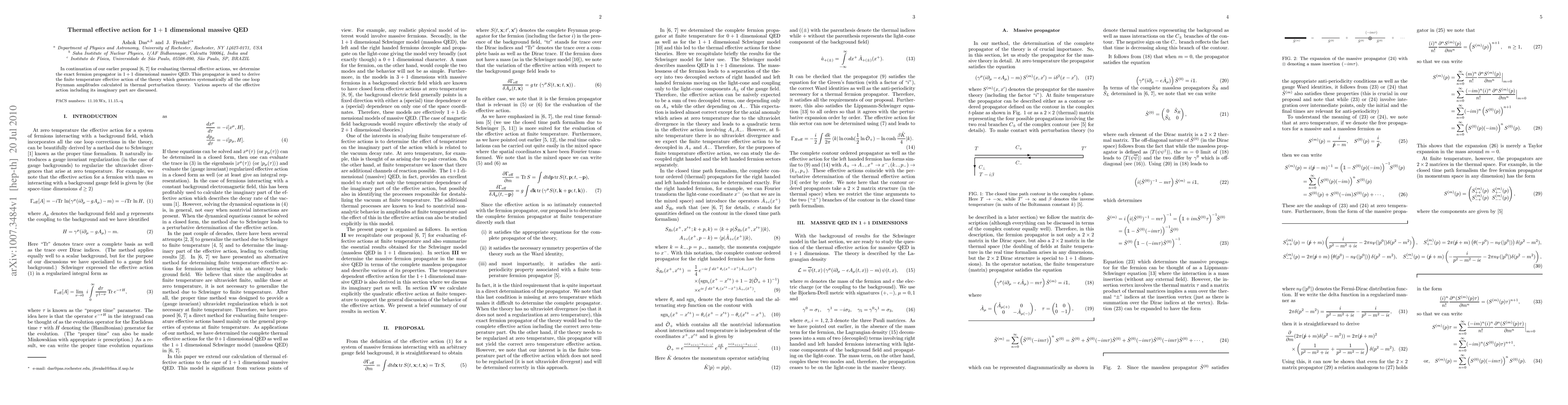 Researchers calculated the exact fermion propagator in 1+1 dimensional massive QED to derive a finite temperature effective action that generates one loop Feynman amplitudes.