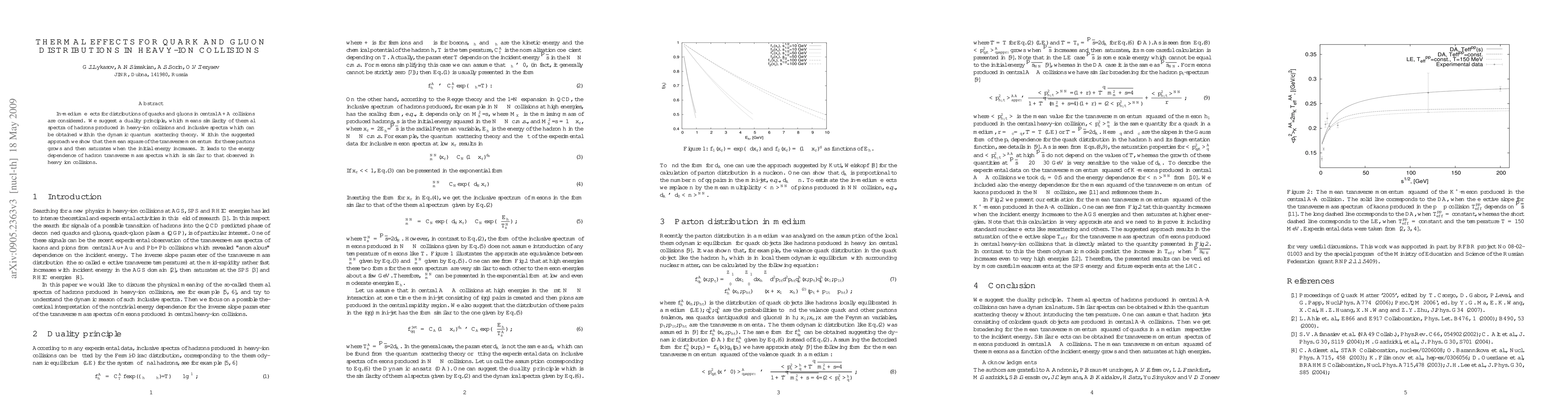 In-medium effects for distributions of quarks and gluons in central A+A collisions are considered. We suggest a duality principle, which means similarity of thermal spectra of hadrons produced in heavy-ion collisions and inclusive spectra which can be obtained within the dynamic quantum scattering theory. Within the suggested approach we show that the mean square of the transverse momentum for these partons grows and then saturates when the initial energy increases. It leads to the energy dependence of hadron transverse mass spectra which is similar to that observed in heavy ion collisions.