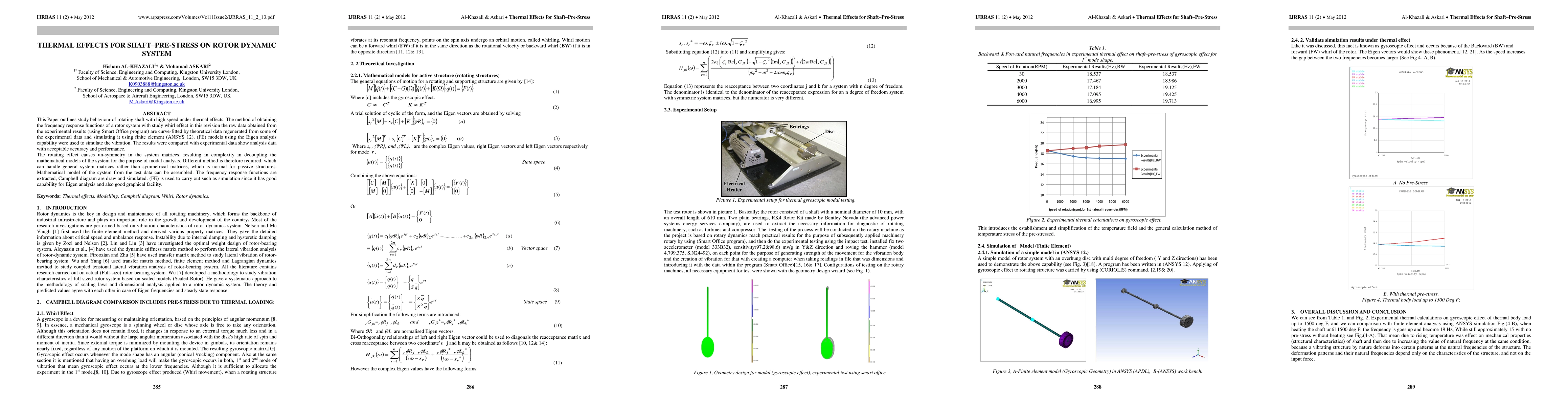 This Paper outlines study behaviour of rotating shaft with high speed under thermal effects. The method of obtaining the frequency response functions of a rotor system with study whirl effect in this revision the raw data obtained from the experimental results (using Smart Office program) are curve-fitted by theoretical data regenerated from some of the experimental data and simulating it using finite element (ANSYS 12). (FE) models using the Eigen analysis capability were used to simulate the vibration. The results were compared with experimental data show analysis data with acceptable accuracy and performance. The rotating effect causes un-symmetry in the system matrices, resulting in complexity in decoupling the mathematical models of the system for the purpose of modal analysis. Different method is therefore required, which can handle general system matrices rather than symmetrical matrices, which is normal for passive structures. Mathematical model of the system from the test data can be assembled. The frequency response functions are extracted, Campbell diagram are draw and simulated. (FE) is used to carry out such as simulation since it has good capability for Eigen analysis and also good graphical facility. Keywords: Thermal effects, Modelling, Campbell diagram, Whirl, Rotor dynamics.