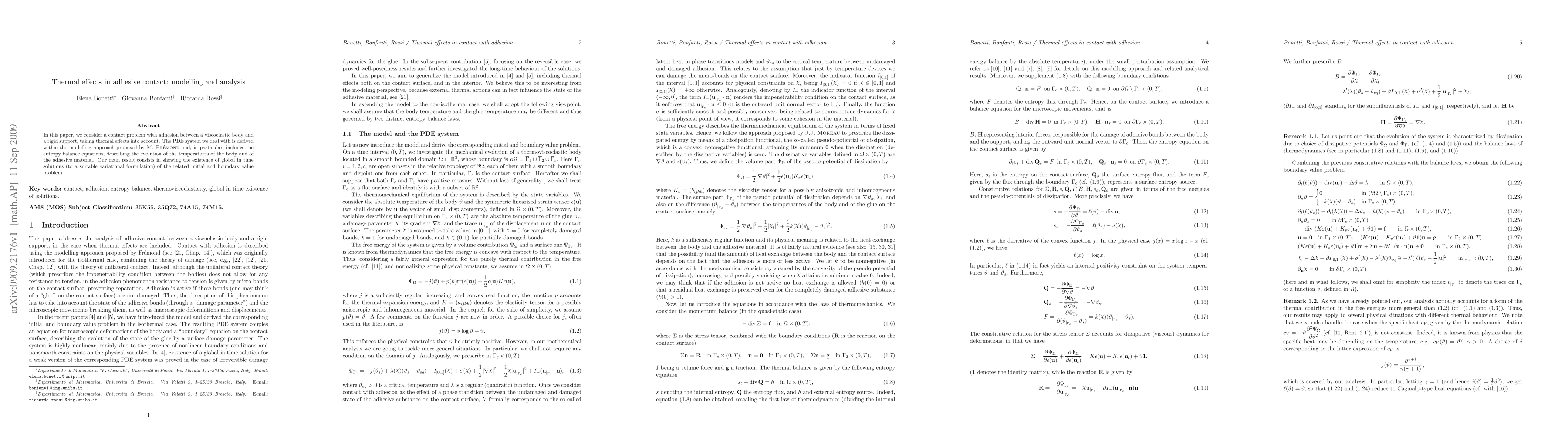 In this paper, we consider a contact problem with adhesion between a viscoelastic body and a rigid support, taking thermal effects into account. The PDE system we deal with is derived within the modelling approach proposed by M. Fremond and, in particular, includes the entropy balance equations, describing the evolution of the temperatures of the body and of the adhesive material. Our main result consists in showing the existence of global in time solutions (to a suitable variational formulation) of the related initial and boundary value problem.