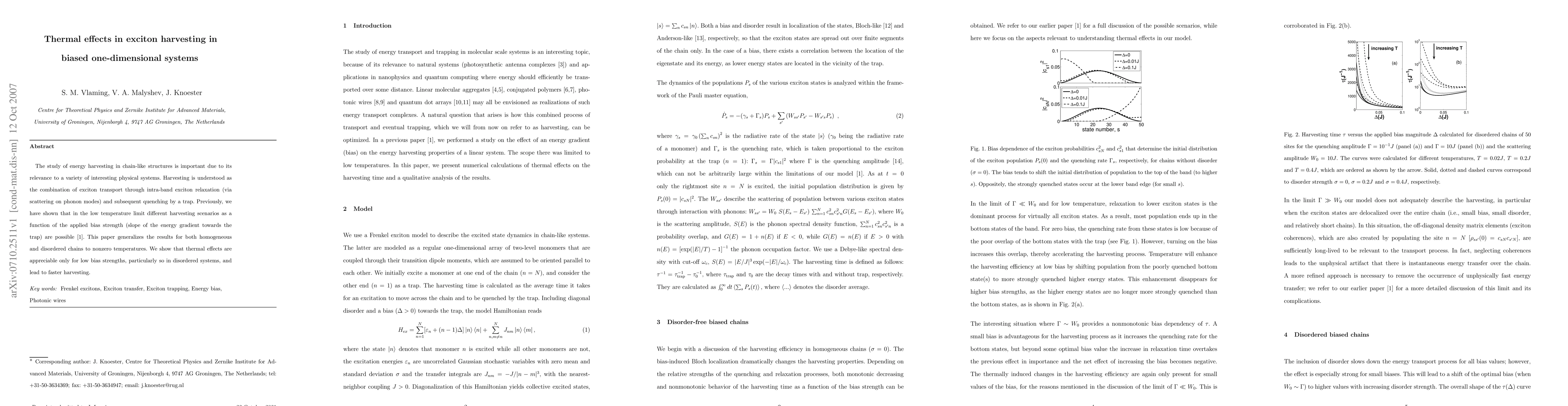 The study of energy harvesting in chain-like structures is important due to its relevance to a variety of interesting physical systems. Harvesting is understood as the combination of exciton transport through intra-band exciton relaxation (via scattering on phonon modes) and subsequent quenching by a trap. Previously, we have shown that in the low temperature limit different harvesting scenarios as a function of the applied bias strength (slope of the energy gradient towards the trap) are possible \cite{Vlaming07}. This paper generalizes the results for both homogeneous and disordered chains to nonzero temperatures. We show that thermal effects are appreciable only for low bias strengths, particularly so in disordered systems, and lead to faster harvesting.