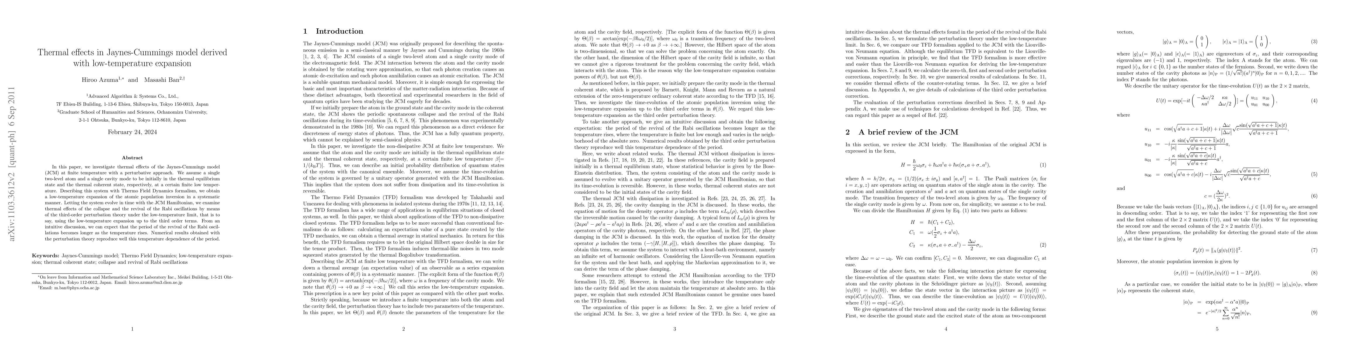 In this paper, we investigate thermal effects of the Jaynes-Cummings model (JCM) at finite temperature with a perturbative approach. We assume a single two-level atom and a single cavity mode to be initially in the thermal equilibrium state and the thermal coherent state, respectively, at a certain finite low temperature. Describing this system with Thermo Field Dynamics formalism, we obtain a low-temperature expansion of the atomic population inversion in a systematic manner. Letting the system evolve in time with the JCM Hamiltonian, we examine thermal effects of the collapse and the revival of the Rabi oscillations by means of the third-order perturbation theory under the low-temperature limit, that is to say, using the low-temperature expansion up to the third order terms. From an intuitive discussion, we can expect that the period of the revival of the Rabi oscillations becomes longer as the temperature rises. Numerical results obtained with the perturbation theory reproduce well this temperature dependence of the period.