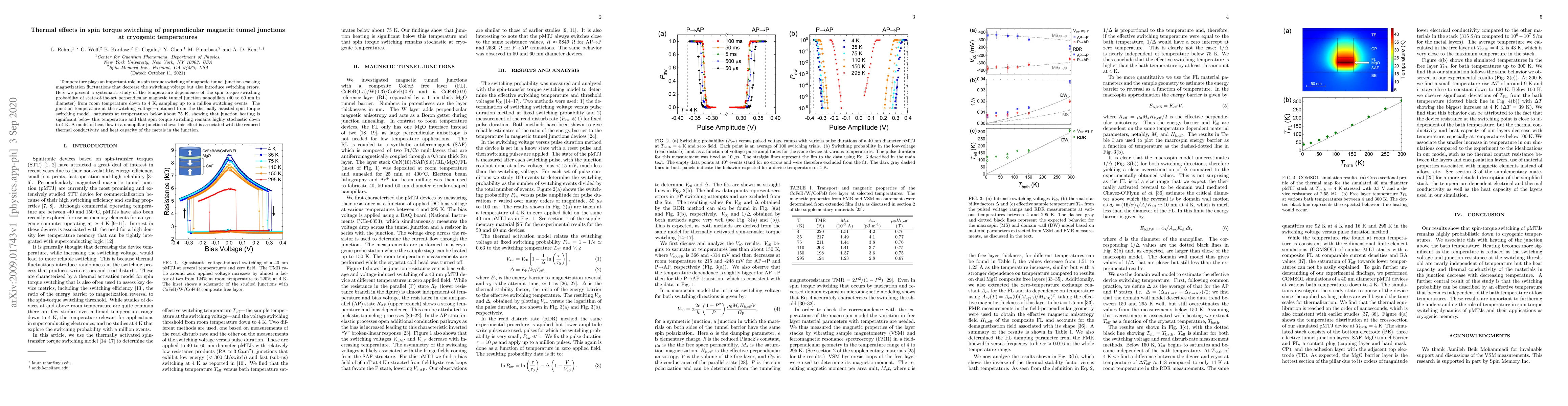 This study investigates the thermal effects on spin torque switching in perpendicular magnetic tunnel junctions at cryogenic temperatures, finding that switching probability decreases with temperature but remains stochastic down to 4 K due to significant junction heating, influenced by reduced thermal conductivity and heat capacity of junction metals.