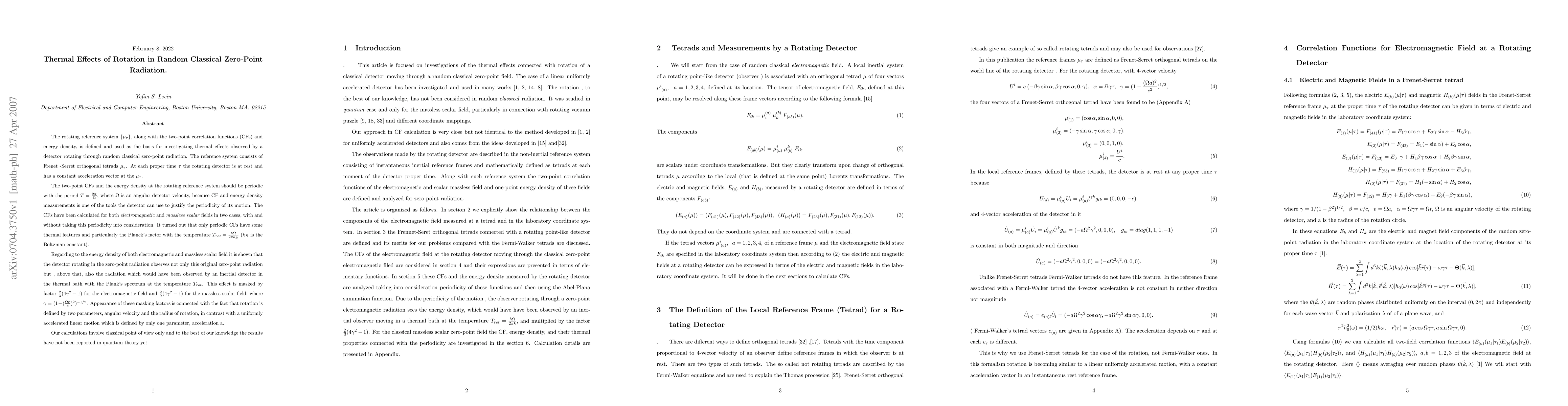 The rotating reference system, two-point correlation functions, and energy density are used as the basis for investigating thermal effects observed by a detector rotating through random classical zero-point radiation. The RS consists of Frenet -Serret orthogonal tetrads where the rotating detector is at rest and has a constant acceleration vector. The CFs and the energy density at the rotating reference system should be periodic with rotation period because CF and energy density measurements is one of the tools the detector can use to justify the periodicity of its motion. The CFs have been calculated for both electromagnetic and massless scalar fields in two cases, with and without taking this periodicity into consideration. It turned out that only periodic CFs have some thermal features and particularly the Planck's factor with the temperature T= h w /k . Regarding to the energy density of both electromagnetic and massless scalar field it is shown that the detector rotating in the zero-point radiation observes not only this original zero-point radiation but, above that, also the radiation which would have been observed by an inertial detector in the thermal bath with the Plank's spectrum at the temperature T. This effect is masked by factor 2/3(4 gamma^2-1) for the electromagnetic field and 2/9 (4 gamma ^2-1) for the massless scalar field, where the Lorentz factor gamma=(1 - v^2 / c^2)^(1/2). Appearance of these masking factors is connected with the fact that rotation is defined by two parameters, angular velocity w and the radius of rotation, in contrast with a uniformly accelerated linear motion which is defined by only one parameter, acceleration a. Our calculations involve classical point of view only and to the best of our knowledge these results have not been reported in quantum theory yet.