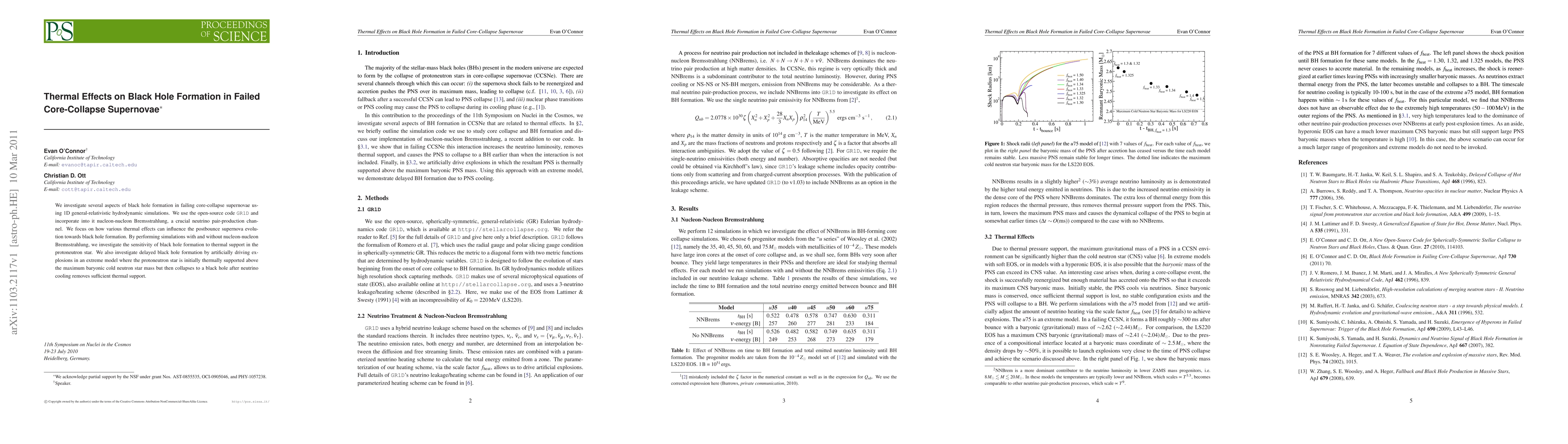 This paper uses 1D general-relativistic hydrodynamic simulations to study black hole formation in failed core-collapse supernovae, focusing on the role of thermal effects and nucleon-nucleon Bremsstrahlung. It examines how thermal support influences black hole formation and explores delayed black hole formation after initial thermal support is removed.