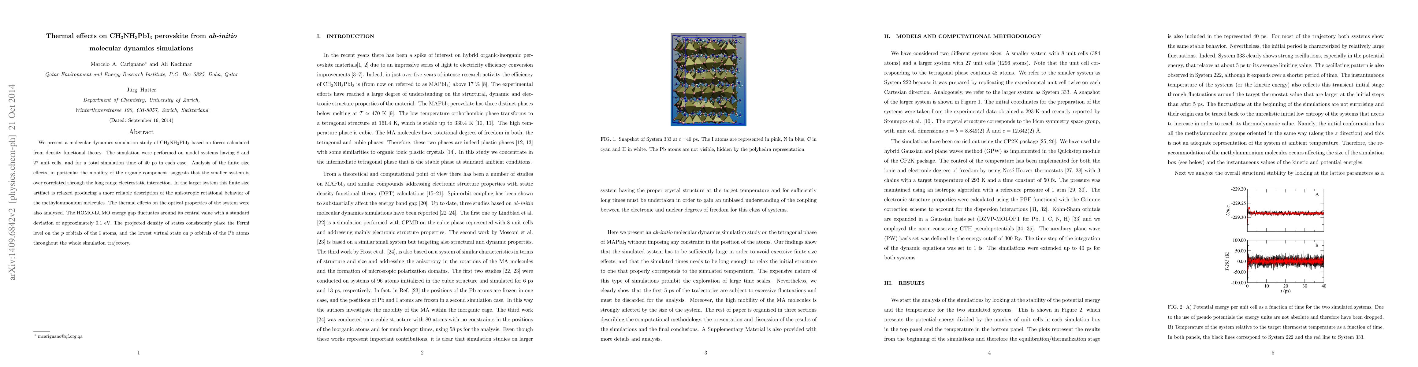 The paper presents a detailed analysis of CH3NH3PbI3 perovskite using ab-initio molecular dynamics, contributing to the understanding of its thermal and structural properties at the atomic level.