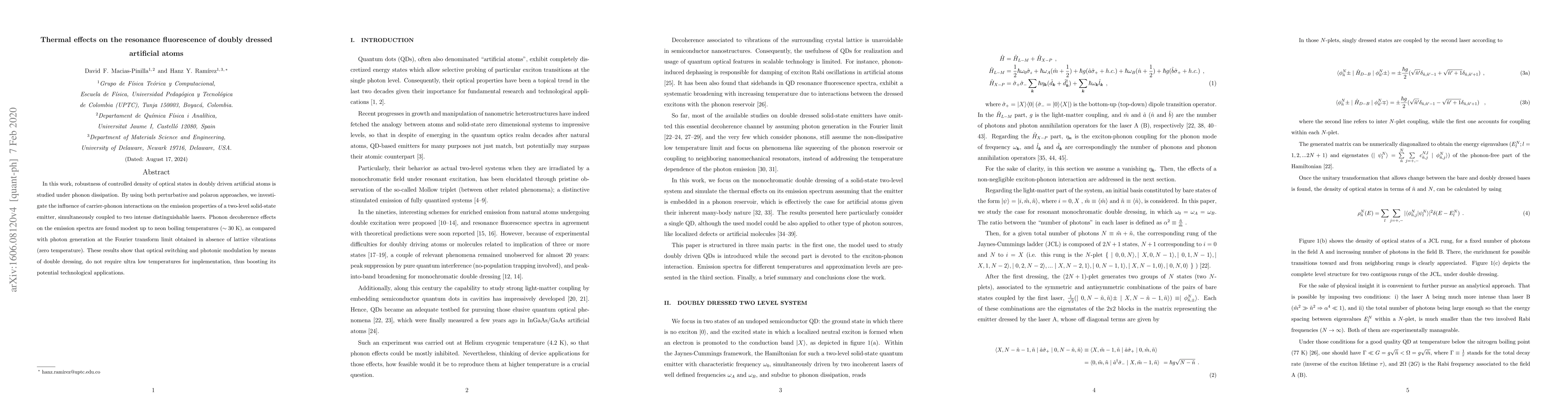 This paper investigates the thermal effects on the resonance fluorescence of doubly dressed artificial atoms, finding that phonon dissipation has modest influence on emission spectra up to 30 K. The study reveals that optical switching and photonic modulation via double dressing can be effectively implemented without ultra-low temperatures, enhancing its technological viability.