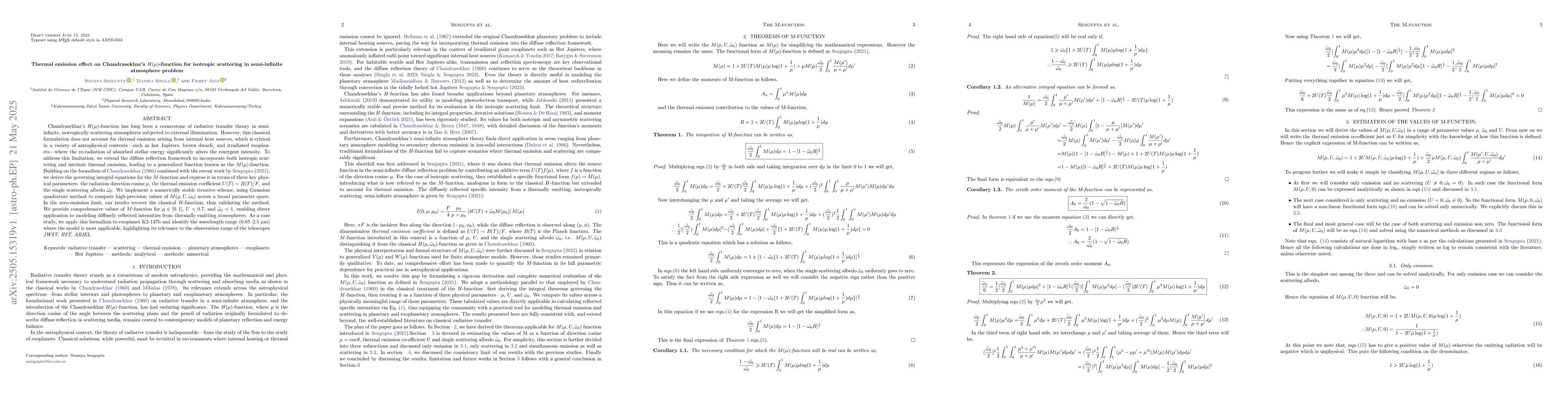 Researchers extended Chandrasekhar's H-function to include thermal emission, creating a new M-function for radiative transfer in atmospheres with internal heat sources, applicable to hot Jupiters and exoplanets.