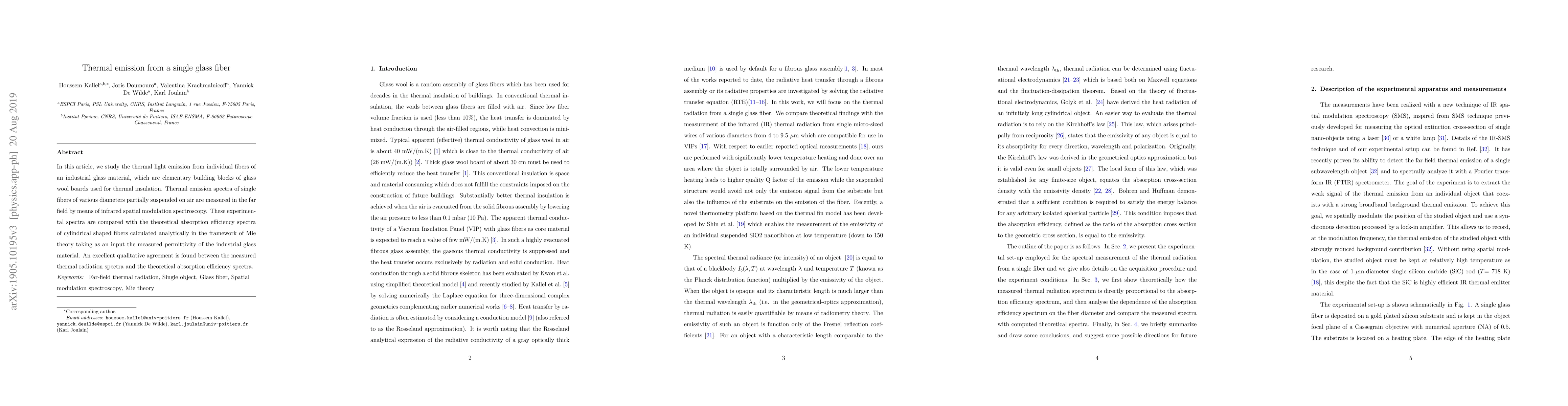 In this article, we study the thermal light emission from individual fibers of an industrial glass material, which are elementary building blocks of glass wool boards used for thermal insulation. Thermal emission spectra of single fibers of various diameters partially suspended on air are measured in the far-field by means of infrared spatial modulation spectroscopy.These experimental spectra are compared with the theoretical absorption efficiency spectra of cylindrical shaped fibers calculated analytically in the framework of Mie theory taking as an input the measured permittivity of the industrial glass material. An excellent qualitative agreement is found between the measured thermal radiation spectra and the theoretical absorption efficiency spectra.