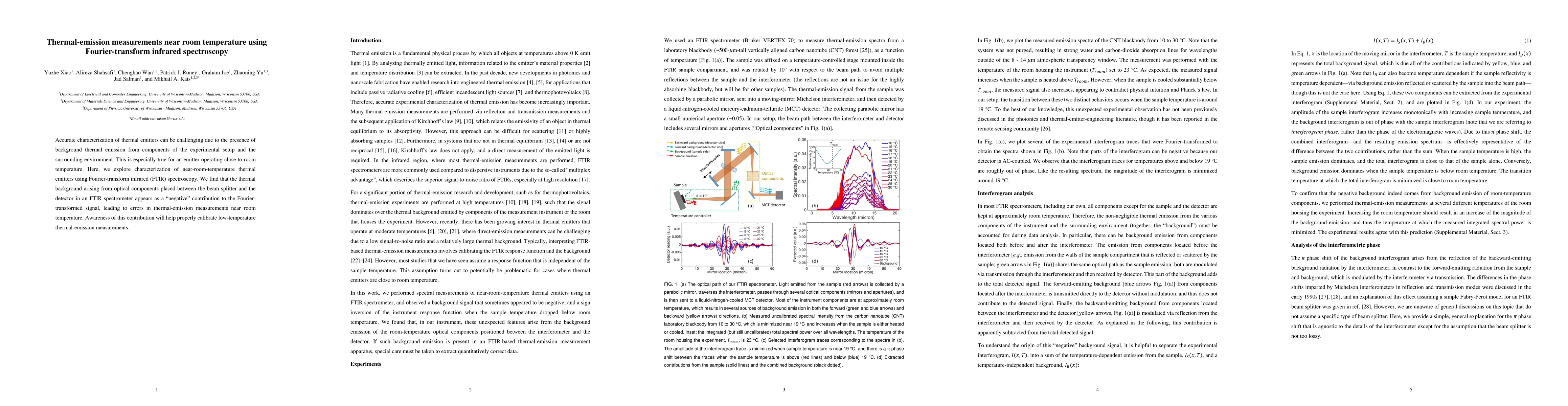Accurate characterization of thermal emitters can be challenging due to the presence of background thermal emission from components of the experimental setup and the surrounding environment. This is especially true for an emitter operating close to room temperature. Here, we explore characterization of near-room-temperature thermal emitters using Fourier-transform infrared (FTIR) spectroscopy. We find that the thermal background arising from optical components placed between the beam splitter and the detector in an FTIR spectrometer appears as a "negative" contribution to the Fourier-transformed signal, leading to errors in thermal-emission measurements near room temperature. Awareness of this contribution will help properly calibrate low-temperature thermal-emission measurements.