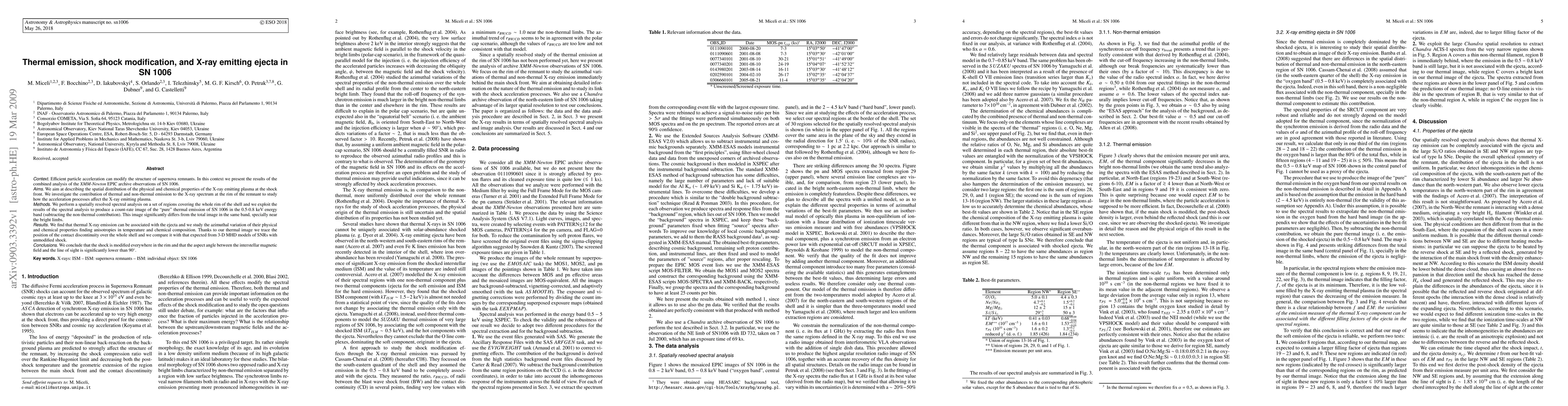 This paper analyzes XMM-Newton observations of SN 1006 to study the thermal emission and shock modification in the supernova remnant. The study reveals anisotropic temperature and chemical composition variations, indicating modified shock fronts influenced by particle acceleration processes.