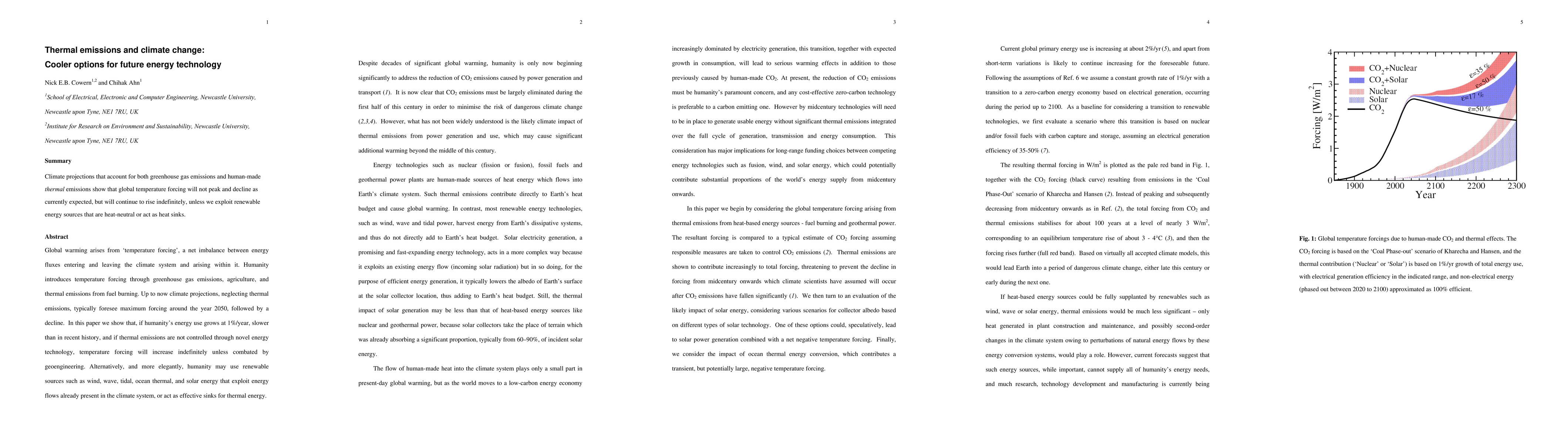 This paper argues that neglecting thermal emissions in climate projections underestimates future temperature forcing, which could increase indefinitely without intervention. It suggests that transitioning to renewable energy sources could provide a more sustainable and cooler alternative to traditional fossil fuel use.