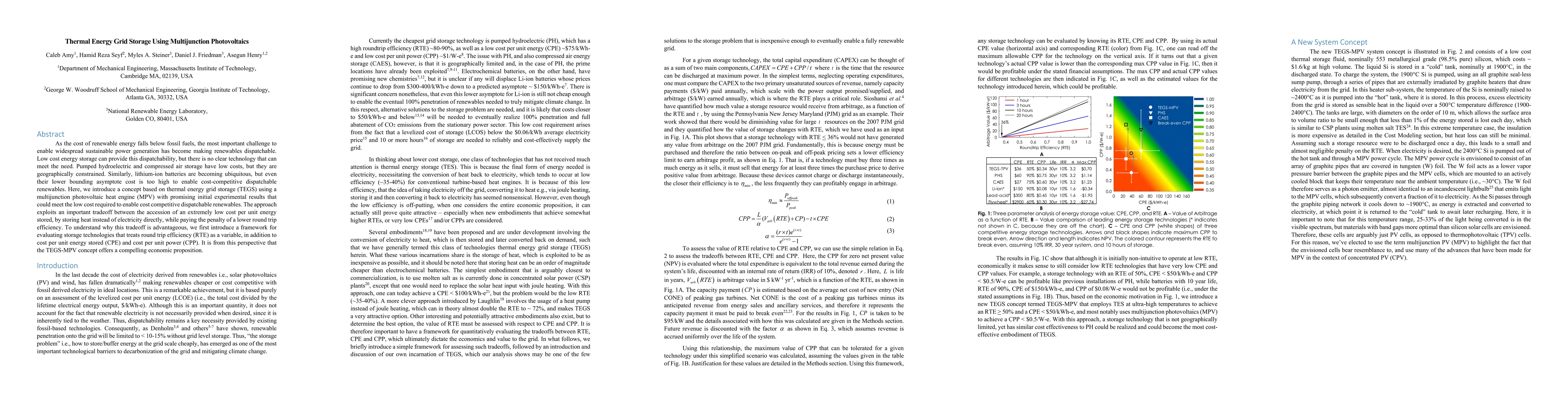 The research introduces a concept for thermal energy grid storage (TEGS) using a multijunction photovoltaic heat engine (MPV), supported by initial experimental results. It proposes a framework to evaluate storage technologies based on round trip efficiency (RTE), cost per unit energy stored (CPE), and cost per unit power (CPP).