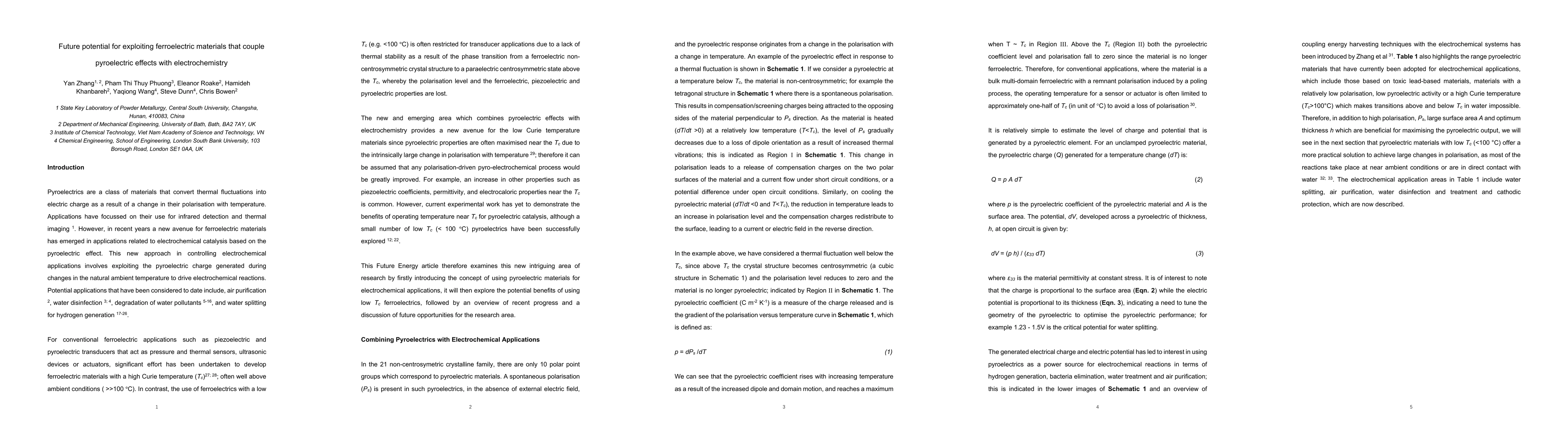 This paper explores the potential of pyroelectric-electrochemical coupling in ferroelectric materials for thermal energy harvesting, emphasizing the use of temperature-induced polarization changes to drive electrochemical processes. It outlines strategies for developing materials that can efficiently convert waste heat into useful electrochemical applications, including water treatment and hydrogen generation.