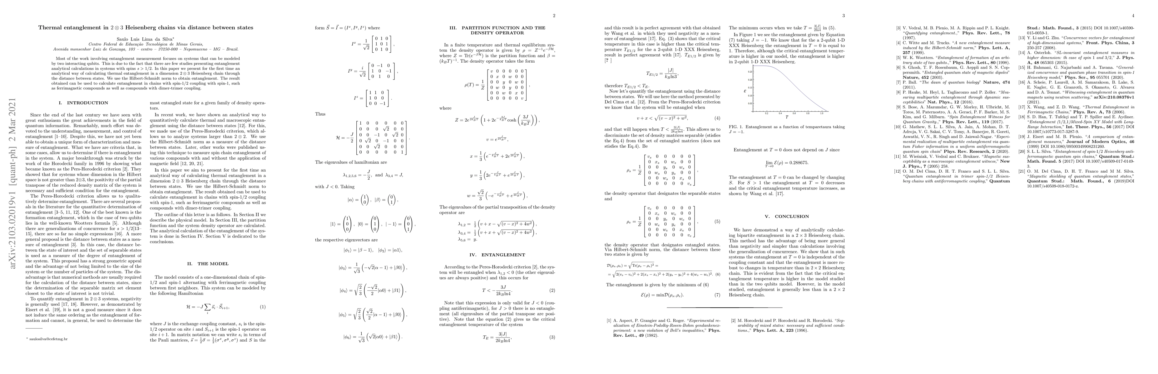 Most of the work involving entanglement measurement focuses on systems that can be modeled by two interacting qubits. This is due to the fact that there are few studies presenting entanglement analytical calculations in systems with spins $s > 1/2$. In this paper we present for the first time an analytical way of calculating thermal entanglement in a dimension $2\otimes3$ Heisenberg chain through the distance between states. We use the Hilbert-Schmidt norm to obtain entanglement. The result obtained can be used to calculate entanglement in chains with spin-$1/2$ coupling with spin-$1$, such as ferrimagnetic compounds as well as compounds with dimer-trimer coupling.