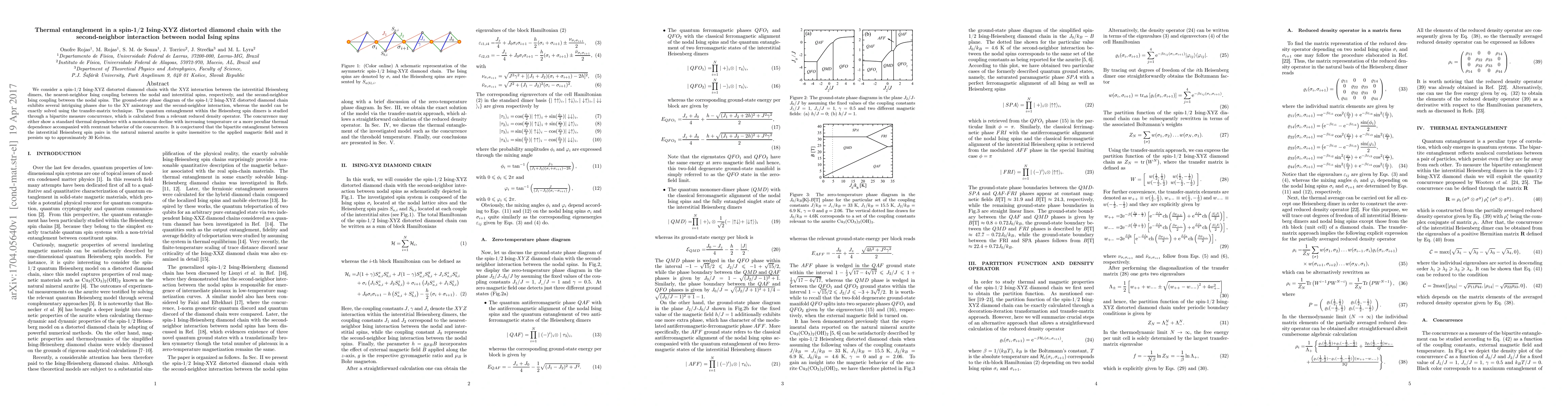 We consider a spin-1/2 Ising-XYZ distorted diamond chain with the XYZ interaction between the interstitial Heisenberg dimers, the nearest-neighbor Ising coupling between the nodal and interstitial spins, respectively, and the second-neighbor Ising coupling between the nodal spins. The ground-state phase diagram of the spin-1/2 Ising-XYZ distorted diamond chain exhibits several intriguing phases due to the XY anisotropy and the second-neighbor interaction, whereas the model can be exactly solved using the transfer-matrix technique. The quantum entanglement within the Heisenberg spin dimers is studied through a bipartite measure concurrence, which is calculated from a relevant reduced density operator. The concurrence may either show a standard thermal dependence with a monotonous decline with increasing temperature or a more peculiar thermal dependence accompanied with reentrant behavior of the concurrence. It is conjectured that the bipartite entanglement between the interstitial Heisenberg spin pairs in the natural mineral azurite is quite insensitive to the applied magnetic field and it persists up to approximately 30 Kelvins.