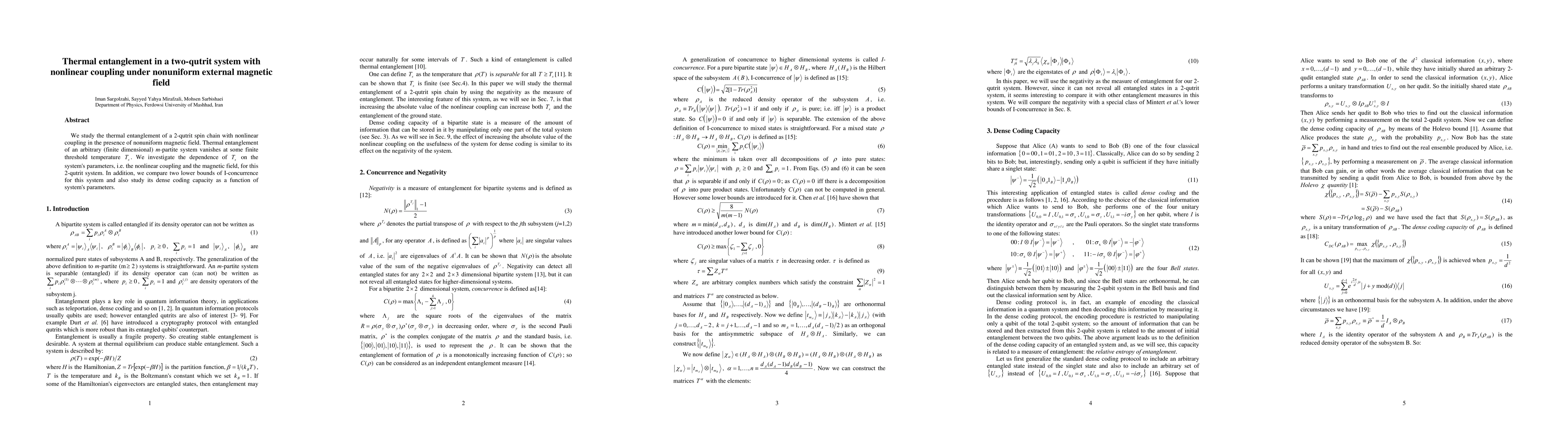 We study the thermal entanglement of a 2-qutrit spin chain with nonlinear coupling in the presence of nonuniform magnetic field. Thermal entanglement of an arbitrary (finite dimensional) m-partite system vanishes at some finite threshold temperature T_s. We investigate the dependence of T_s on the system's parameters, i.e. the nonlinear coupling and the magnetic field, for this 2-qutrit system. In addition, we compare two lower bounds of I-concurrence for this system and also study its dense coding capacity as a function of system's parameters.