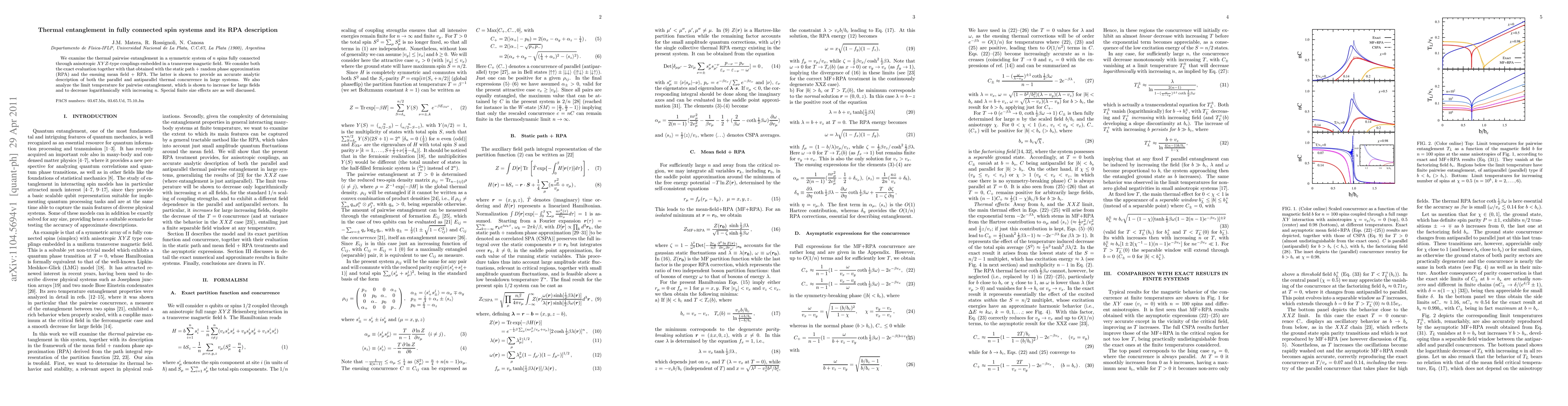 We examine the thermal pairwise entanglement in a symmetric system of $n$ spins fully connected through anisotropic $XYZ$-type couplings embedded in a transverse magnetic field. We consider both the exact evaluation together with that obtained with the static path + random phase approximation (RPA) and the ensuing mean field + RPA. The latter is shown to provide an accurate analytic description of both the parallel and antiparallel thermal concurrence in large systems. We also analyze the limit temperature for pairwise entanglement, which is shown to increase for large fields and to decrease logarithmically with increasing $n$. Special finite size effects are as well discussed.