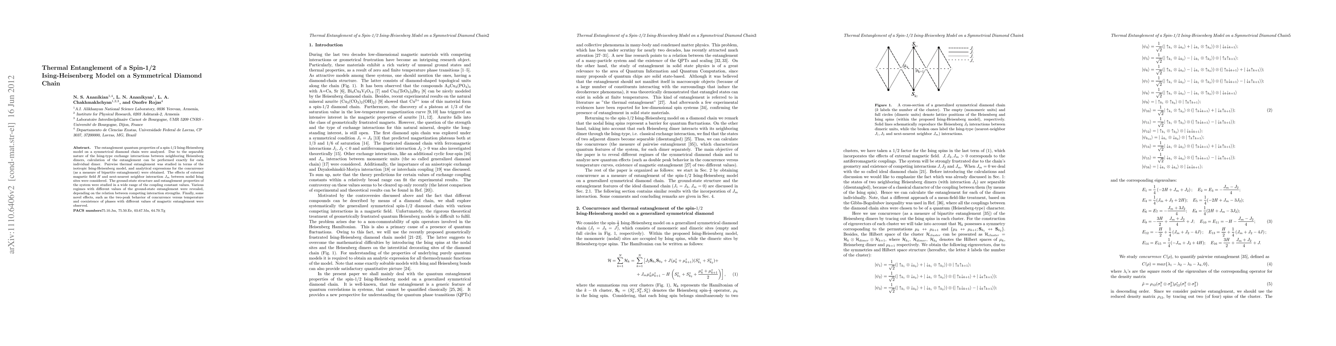 This paper analyzes the thermal entanglement in a spin-1/2 Ising-Heisenberg model on a symmetrical diamond chain, deriving exact analytical expressions for concurrence. It explores the effects of external magnetic fields and next-nearest neighbor interactions, revealing various entanglement regimes and novel effects like two-peak concurrence behavior.