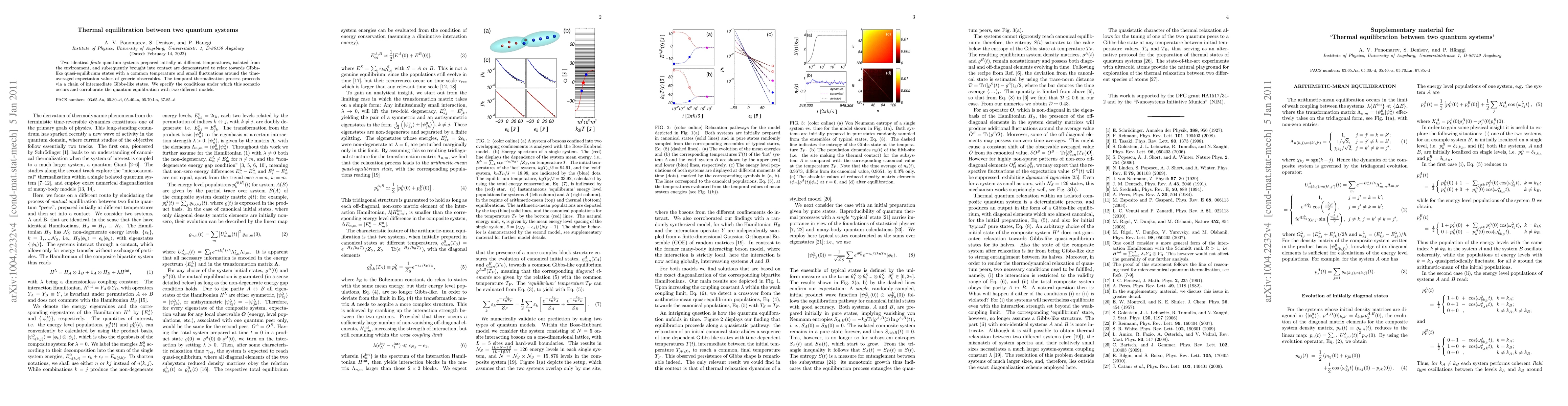 Two identical finite quantum systems initially at different temperatures equilibrate to a common temperature when isolated and then brought into contact, transitioning through a series of intermediate Gibbs-like states. This thermal equilibration is demonstrated and analyzed in two different models.