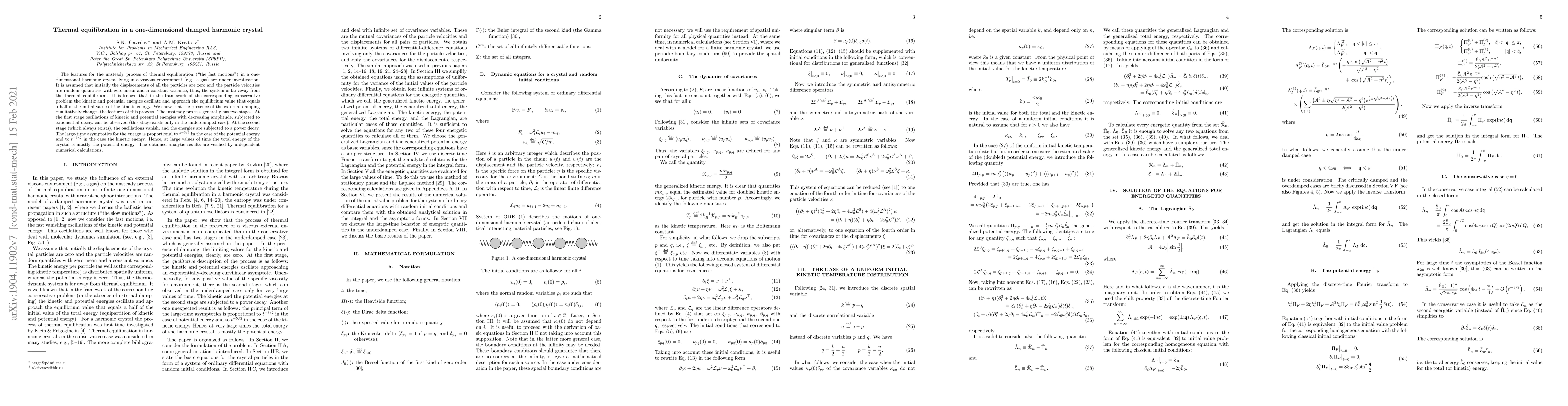 The features for the unsteady process of thermal equilibration ("the fast motions") in a one-dimensional harmonic crystal lying in a viscous environment (e.g., a gas) are under investigation. It is assumed that initially the displacements of all the particles are zero and the particle velocities are random quantities with zero mean and a constant variance, thus, the system is far away from the thermal equilibrium. It is known that in the framework of the corresponding conservative problem the kinetic and potential energies oscillate and approach the equilibrium value that equals a half of the initial value of the kinetic energy. We show that the presence of the external damping qualitatively changes the features of this process. The unsteady process generally has two stages. At the first stage oscillations of kinetic and potential energies with decreasing amplitude, subjected to exponential decay, can be observed (this stage exists only in the underdamped case). At the second stage (which always exists), the oscillations vanish, and the energies are subjected to a power decay. The large-time asymptotics for the energy is proportional to $t^{-3/2}$ in the case of the potential energy and to $t^{-5/2}$ in the case the kinetic energy. Hence, at large values of time the total energy of the crystal is mostly the potential energy. The obtained analytic results are verified by independent numerical calculations.