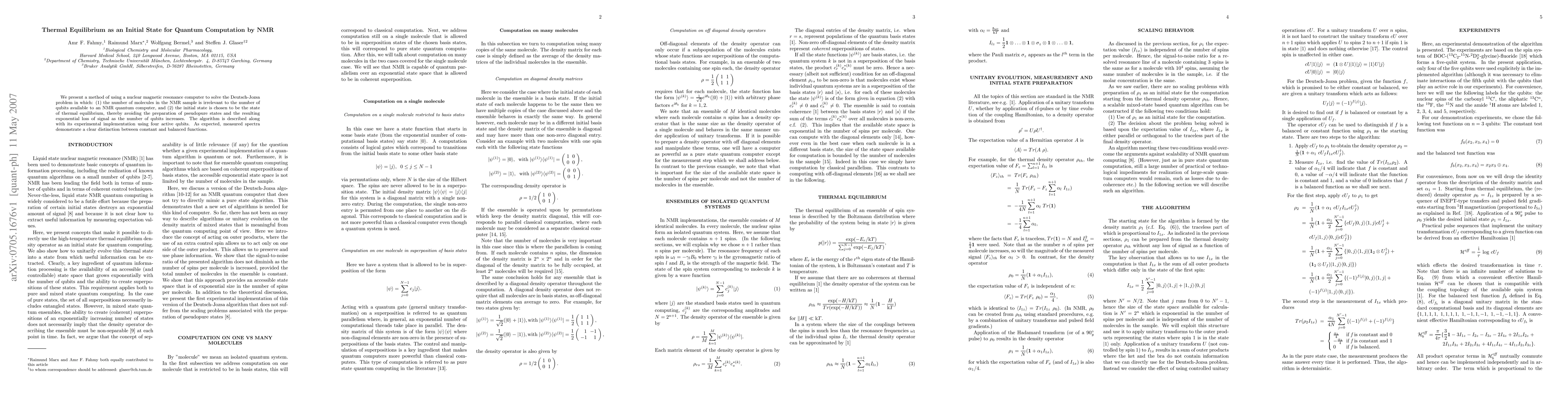 We present a method of using a nuclear magnetic resonance computer to solve the Deutsch-Jozsa problem in which: (1) the number of molecules in the NMR sample is irrelevant to the number of qubits available to an NMR quantum computer, and (2) the initial state is chosen to be the state of thermal equilibrium, thereby avoiding the preparation of pseudopure states and the resulting exponential loss of signal as the number of qubits increases. The algorithm is described along with its experimental implementation using four active qubits. As expected, measured spectra demonstrate a clear distinction between constant and balanced functions.