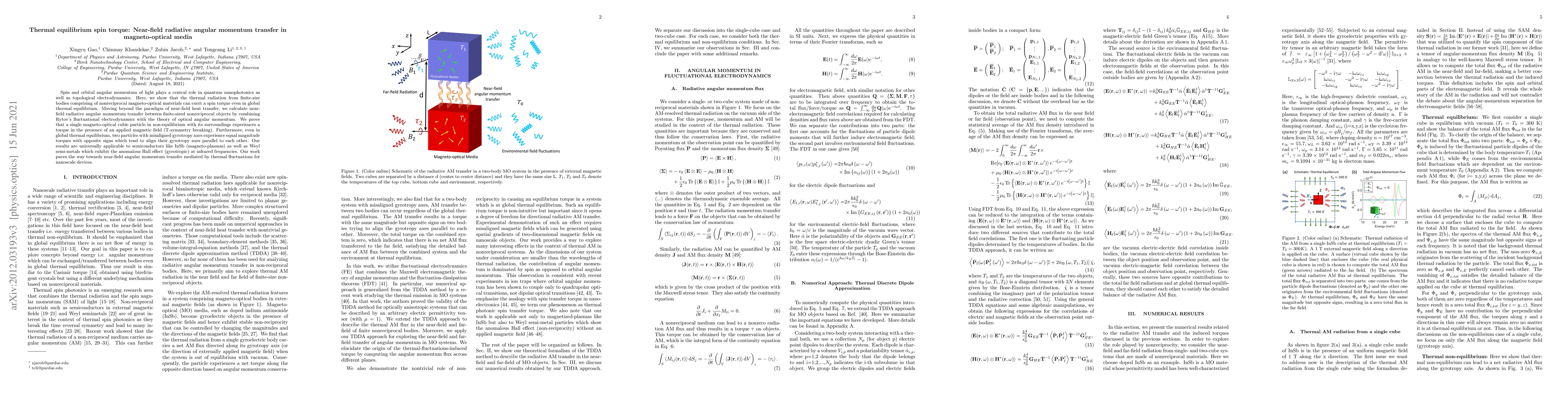 Spin and orbital angular momentum of light plays a central role in quantum nanophotonics as well as topological electrodynamics. Here, we show that the thermal radiation from finite-sized bodies comprising of nonreciprocal magneto-optical materials can exert a spin torque even in global thermal equilibrium. Moving beyond the paradigm of near-field heat transfer, we calculate near-field radiative angular momentum transfer between finite-sized nonreciprocal objects by combining Rytov's fluctuational electrodynamics with the theory of optical angular momentum. We prove that a single magneto-optical cubic particle in non-equilibrium with its surroundings experiences a torque in the presence of an applied magnetic field (T-symmetry breaking). Furthermore, even in global thermal equilibrium, two particles with misaligned gyrotropic axes experience equal magnitude torques with opposite signs which tend to align their gyrotropic axes parallel to each other. Our results are universally applicable to semiconductors like InSb (magneto-plasmas) as well as Weyl semi-metals which exhibit the anomalous Hall effect (gyrotropy) at infrared frequencies. Our work paves the way towards near-field angular momentum transfer mediated by thermal fluctuations for nanoscale devices.