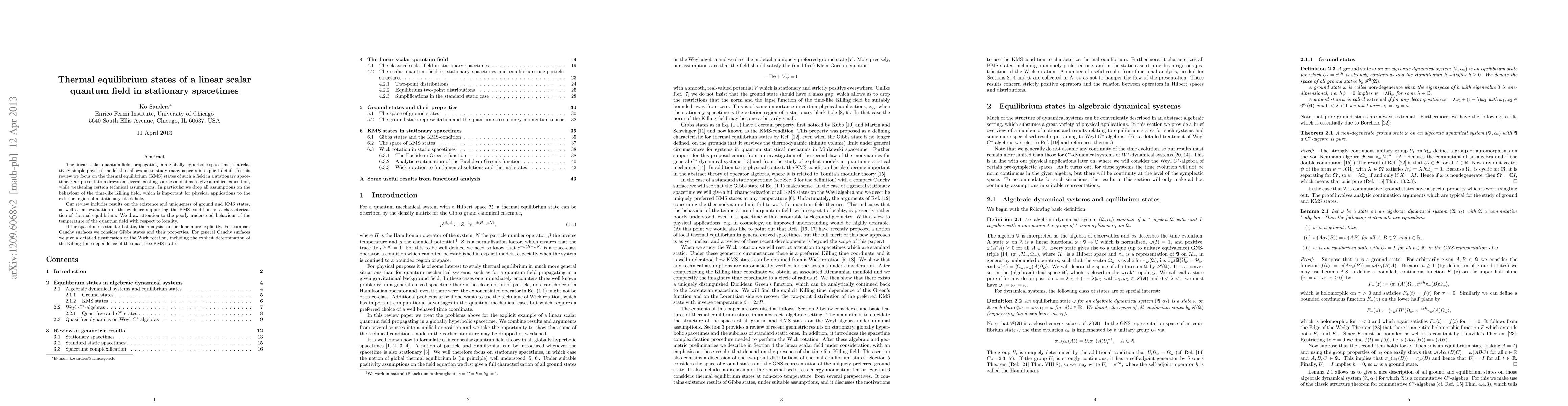 The linear scalar quantum field, propagating in a globally hyperbolic spacetime, is a relatively simple physical model that allows us to study many aspects in explicit detail. In this review we focus on the theory of thermal equilibrium (KMS) states of such a field in a stationary spacetime. Our presentation draws on several existing sources and aims to give a unified exposition. We also take the opportunity to weaken some of the technical assumptions of the earlier literature. In particular, we completely drop any assumptions on the behaviour of the norm and lapse of the Killing field. This is especially important for physical applications to the exterior region of a stationary black hole. Our review includes results on the existence of a unique ground state and of unique quasi-free KMS states, as well as an evaluation of the evidence that motivates the use of the KMS-condition to characterise thermal equilibrium. We especially draw attention to the poorly understood behaviour of the notion of temperature of a quantum field with respect to locality. If the spacetime is standard static (i.e. if it admits a Cauchy surface that is orthogonal to the Killing field) the analysis can be done even more explicitly. For compact Cauchy surfaces we consider Gibbs states and their properties. For general Cauchy surfaces we give a detailed and rigorous justification of the technique of Wick rotation, including the explicit determination of the Killing-time dependence of the quasi-free KMS states.