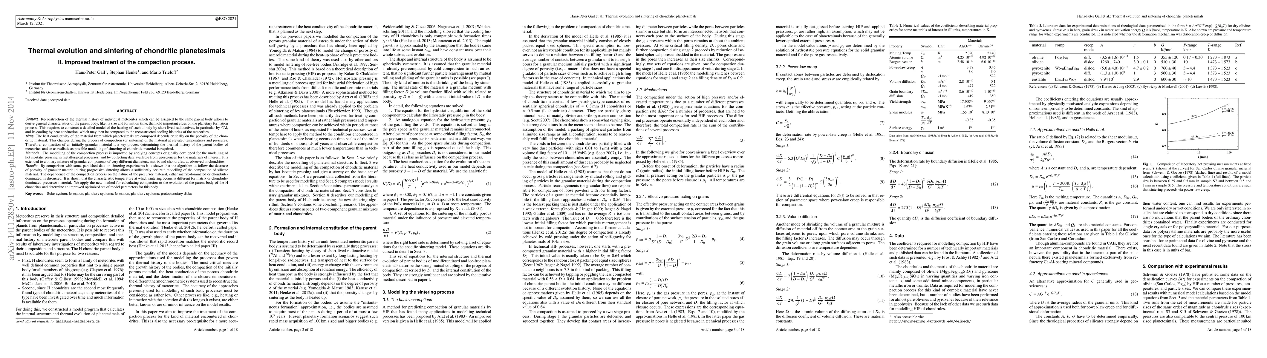 This paper improves the modelling of the compaction process in chondritic planetesimals by applying metallurgical concepts to simulate the sintering of silicate materials. The new method accurately models the thermal evolution of the parent body of H chondrites, providing optimized parameters for understanding planetary formation processes.
