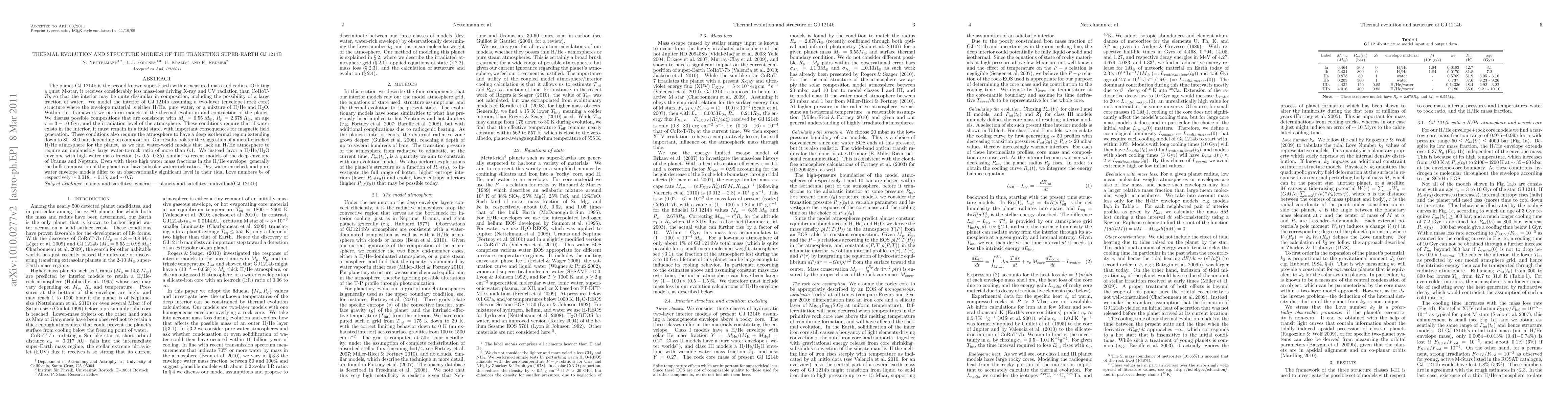 The planet GJ 1214b is the second known super-Earth with a measured mass and radius. Orbiting a quiet M-star, it receives considerably less mass-loss driving X-ray and UV radiation than CoRoT-7b, so that the interior may be quite dissimilar in composition, including the possibility of a large fraction of water. We model the interior of GJ 1214b assuming a two-layer (envelope+rock core) structure where the envelope material is either H/He, pure water, or a mixture of H/He and H2O. Within this framework we perform models of the thermal evolution and contraction of the planet. We discuss possible compositions that are consistent with Mp=6.55 ME, Rp=2.678 RE, an age tau=3-10 Gyr, and the irradiation level of the atmosphere. These conditions require that if water exists in the interior, it must remain in a fluid state, with important consequences for magnetic field generation. These conditions also require the atmosphere to have a deep isothermal region extending down to 80-800 bar, depending on composition. Our results bolster the suggestion of a metal-enriched H/He atmosphere for the planet, as we find water-world models that lack an H/He atmosphere to require an implausibly large water-to-rock ratio of more than 6:1. We instead favor a H/He/H2O envelope with high water mass fraction (~0.5-0.85), similar to recent models of the deep envelope of Uranus and Neptune. Even with these high water mass fractions in the H/He envelope, generally the bulk composition of the planet can have subsolar water:rock ratios. Dry, water-enriched, and pure water envelope models differ to an observationally significant level in their tidal Love numbers k2 of respectively ~0.018, 0.15, and 0.7.