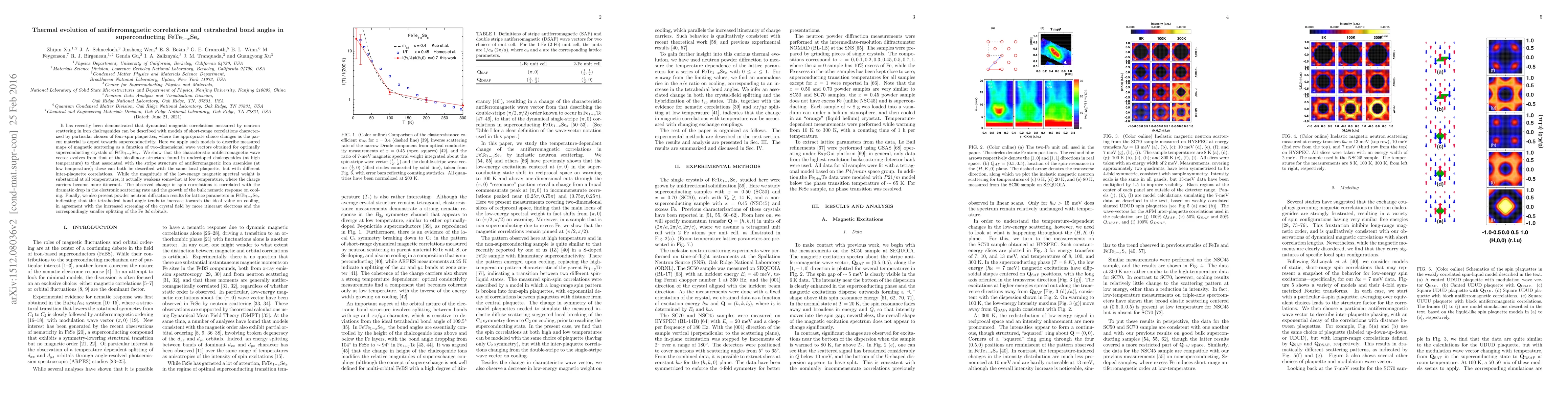 It has recently been demonstrated that dynamical magnetic correlations measured by neutron scattering in iron chalcogenides can be described with models of short-range correlations characterized by particular {choices of four-spin plaquettes, where the appropriate choice changes as the} parent material is doped towards superconductivity. Here we apply such models to describe measured maps of magnetic scattering as a function of two-dimensional wave vectors obtained for optimally superconducting crystals of FeTe$_{1-x}$Se$_x$. We show that the characteristic antiferromagnetic wave vector evolves from that of the bicollinear structure found in underdoped chalcogenides (at high temperature) to that associated with the stripe structure of antiferromagnetic iron arsenides (at low temperature); {these can both be described with the same local plaquette, but with different inter-plaquette correlations}. While the magnitude of the low-energy magnetic spectral weight is substantial at all temperatures, it actually weakens somewhat at low temperature, where the charge carriers become more itinerant. The observed change in spin correlations is correlated with the dramatic drop in the electronic scattering rate and the growth of the bulk nematic response on cooling. Finally, we also present powder neutron diffraction results for lattice parameters in FeTe$_{1-x}$Se$_x$ indicating that the tetrahedral bond angle tends to increase towards the ideal value on cooling, in agreement with the increased screening of the crystal field by more itinerant electrons and the correspondingly smaller splitting of the Fe $3d$ orbitals.
