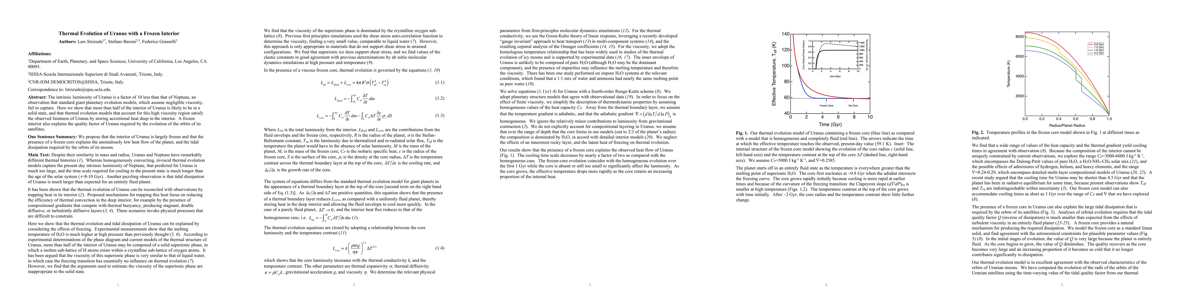 This paper proposes that Uranus's low intrinsic luminosity compared to Neptune can be explained by a solid, viscous interior that retains accretional heat, contrasting with standard evolution models. This frozen interior also aligns with the observed orbital dynamics of Uranus's satellites.