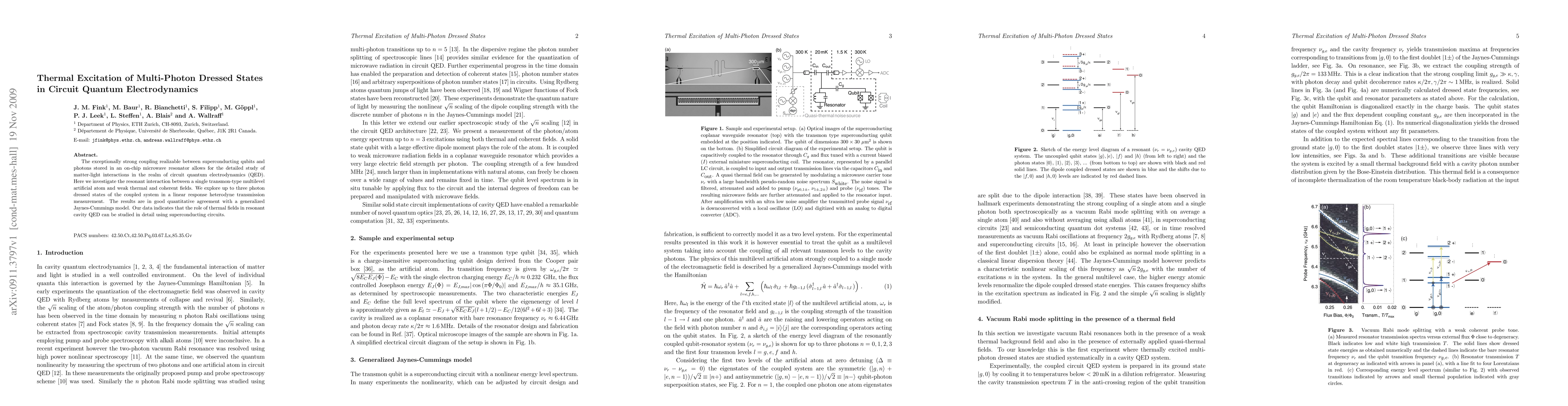 This paper investigates the interaction between a superconducting qubit and microwave photons in a resonator, exploring up to three photon dressed states. The study reveals detailed matter-light interactions in circuit quantum electrodynamics, with results aligning well with a generalized Jaynes-Cummings model, demonstrating the potential of superconducting circuits for studying thermal fields.