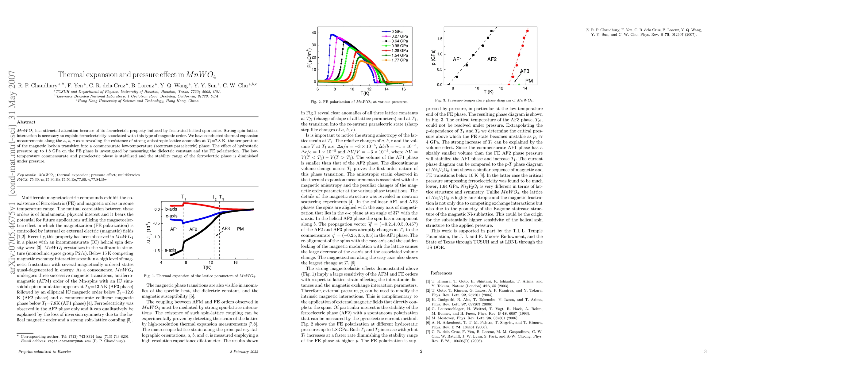 This paper investigates the thermal expansion and pressure effects in MnWO4, revealing strong anisotropic lattice anomalies at a critical temperature linked to a magnetic lock-in transition. Hydrostatic pressure diminishes the stability of the ferroelectric phase, stabilizing the low-temperature paraelectric phase.