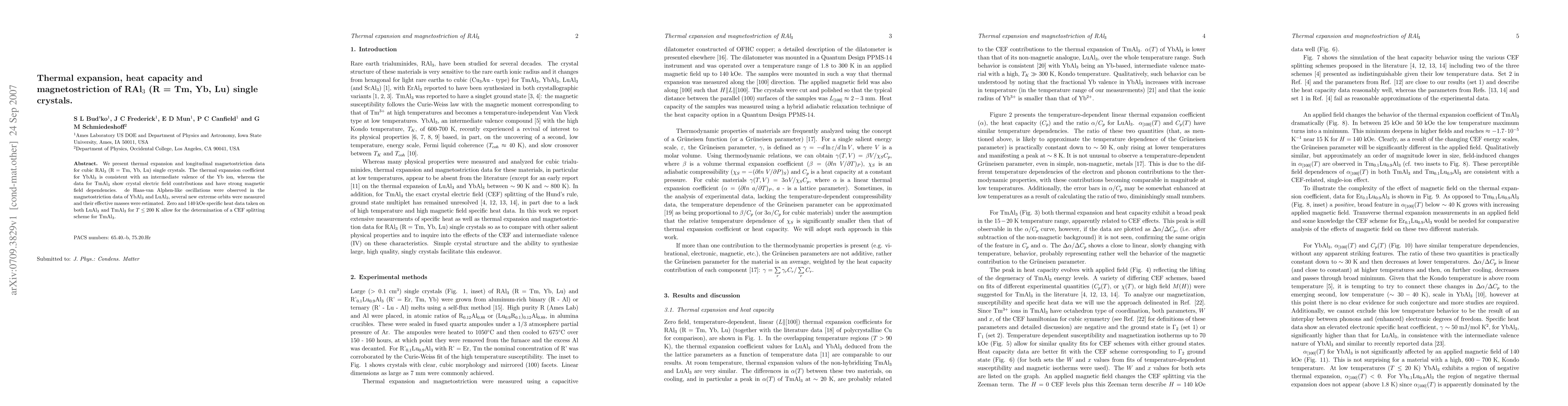 We present thermal expansion and longitudinal magnetostriction data for cubic RAl3 (R = Tm, Yb, Lu) single crystals. The thermal expansion coefficient for YbAl3 is consistent with an intermediate valence of the Yb ion, whereas the data for TmAl3 show crystal electric field contributions and have strong magnetic field dependencies. de Haas-van Alphen-like oscillations were observed in the magnetostriction data of YbAl3 and LuAl3, several new extreme orbits were measured and their effective masses were estimated. Zero and 140 kOe specific heat data taken on both LuAl3 and TmAl3 for T < 200 K allow for the determination of a CEF splitting scheme for TmAl3.