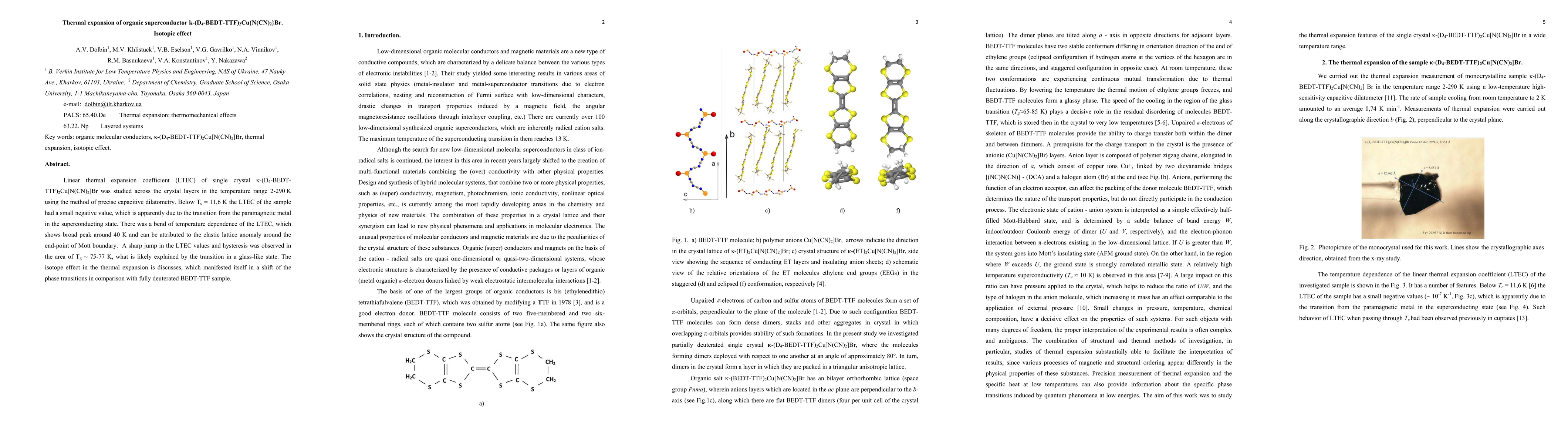 Linear thermal expansion coefficient (LTEC) of single crystal k-(D4-BEDT-TTF)2Cu[N(CN)2]Br was studied across the crystal layers in the temperature range 2-290 K using the method of precise capacitive dilatometry. Below Tc = 11,6 K the LTEC of the sample had a small negative value, which is apparently due to the transition from the paramagnetic metal in the superconducting state. There was a bend of temperature dependence of the LTEC, which shows broad peak around 40 K and can be attributed to the elastic lattice anomaly around the end-point of Mott boundary. A sharp jump in the LTEC values and hysteresis was observed in the area of Tg ~ 75-77 K, what is likely explained by the transition in a glass-like state. The isotope effect in the thermal expansion is discusses, which manifested itself in a shift of the phase transitions in comparison with fully deuterated BEDT-TTF sample.