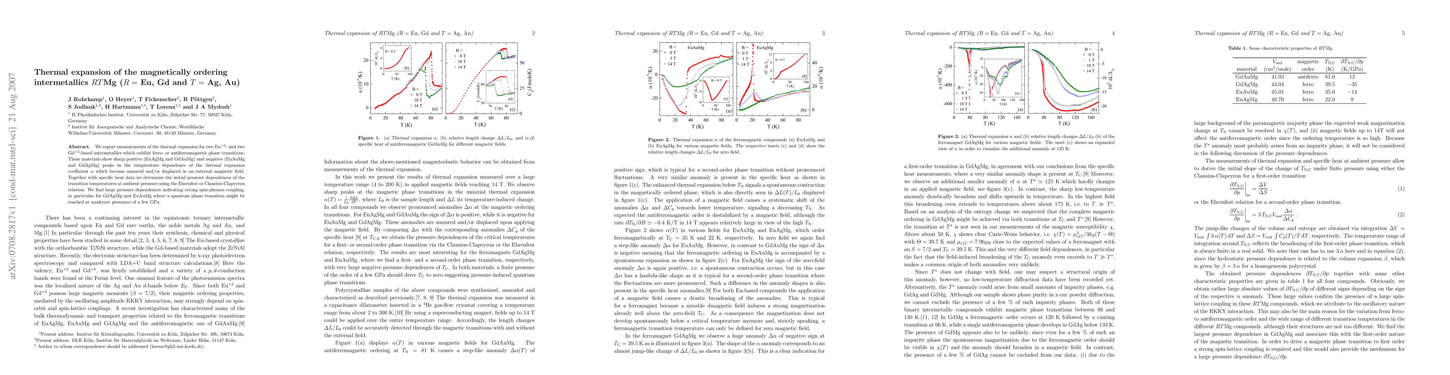 We report measurements of the thermal expansion for two Eu$^{+2}$- and two Gd$^{+3}$-based intermetallics which exhibit ferro- or antiferromagnetic phase transitions. These materials show sharp positive (EuAgMg and GdAuMg) and negative (EuAuMg and GdAgMg) peaks in the temperature dependence of the thermal expansion coefficient $\alpha$ which become smeared and/or displaced in an external magnetic field. Together with specific heat data we determine the initial pressure dependences of the transition temperatures at ambient pressure using the Ehrenfest or Clausius-Clapeyron relation. We find large pressure dependences indicating strong spin-phonon coupling, in particular for GdAgMg and EuAuMg where a quantum phase transition might be reached at moderate pressures of a few GPa.
